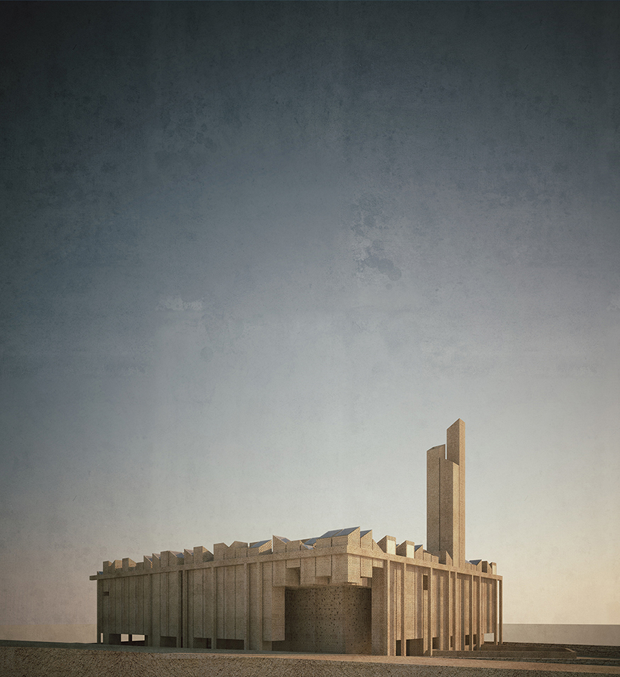 La Moschea, di 3200 mq per 310 posti preghiera – che vedrà la posa della prima pietra a gennaio 2019 e la fine lavori per marzo 2020 – è un monolite complesso, scultoreo, una struttura a telaio nuda, brutalista, che inverte l’ordine d’importanza dei prospetti, concentrando la sua principale bellezza nel piano di copertura: una distesa di cannon lumière sghembi che inondano l’interno di luce naturale zenitale. Un’architettura espressionista quasi, parzialmente introversa, che esplicita la propria funzione religiosa grazie a due elementi: un alto minareto e una sottile lastra di onice semitrasparente rivolta alla Mecca. Valerio Paolo Mosco la definisce “come ‘architettura parlante’, oggetto che immediatamente e senza infingimenti comunica non solo la sua funzione, ma anche il suo carattere e più che altro il suo carattere in quel luogo. Non è un caso che la scelta sia stata quella di realizzare l’edificio in cemento armato a vista, quasi a voler evocare con la materia grezza, nuda e plastica, l’arido terreno che la circonda, come se fosse un rudere senza tempo in una terra altrettanto senza tempo”. Forte è il contrasto materico e percettivo tra esterno e interno, trattato come un tappeto di colori, uno spazio sacro che invita alla contemplazione e al raccoglimento trascendente. Una rosa del deserto, una roccaforte pensata per durare in eterno. Continua Mosco: “Equilibrio tra figura e astrazione e uso a effetto della luce naturale: ecco i poli su cui si è attestata la migliore architettura sacra moderna e post-moderna e il merito maggiore di Gianluca Peluffo&Partners è quello di essersi posti come fine, quello di riferirsi direttamente a questi due poli, assoggettando a essi tutte le altre questioni che un progetto complesso come questo in esame pone”.