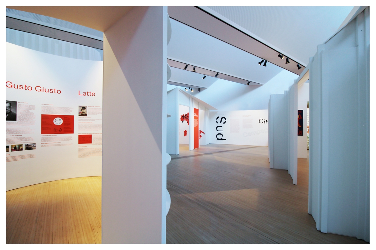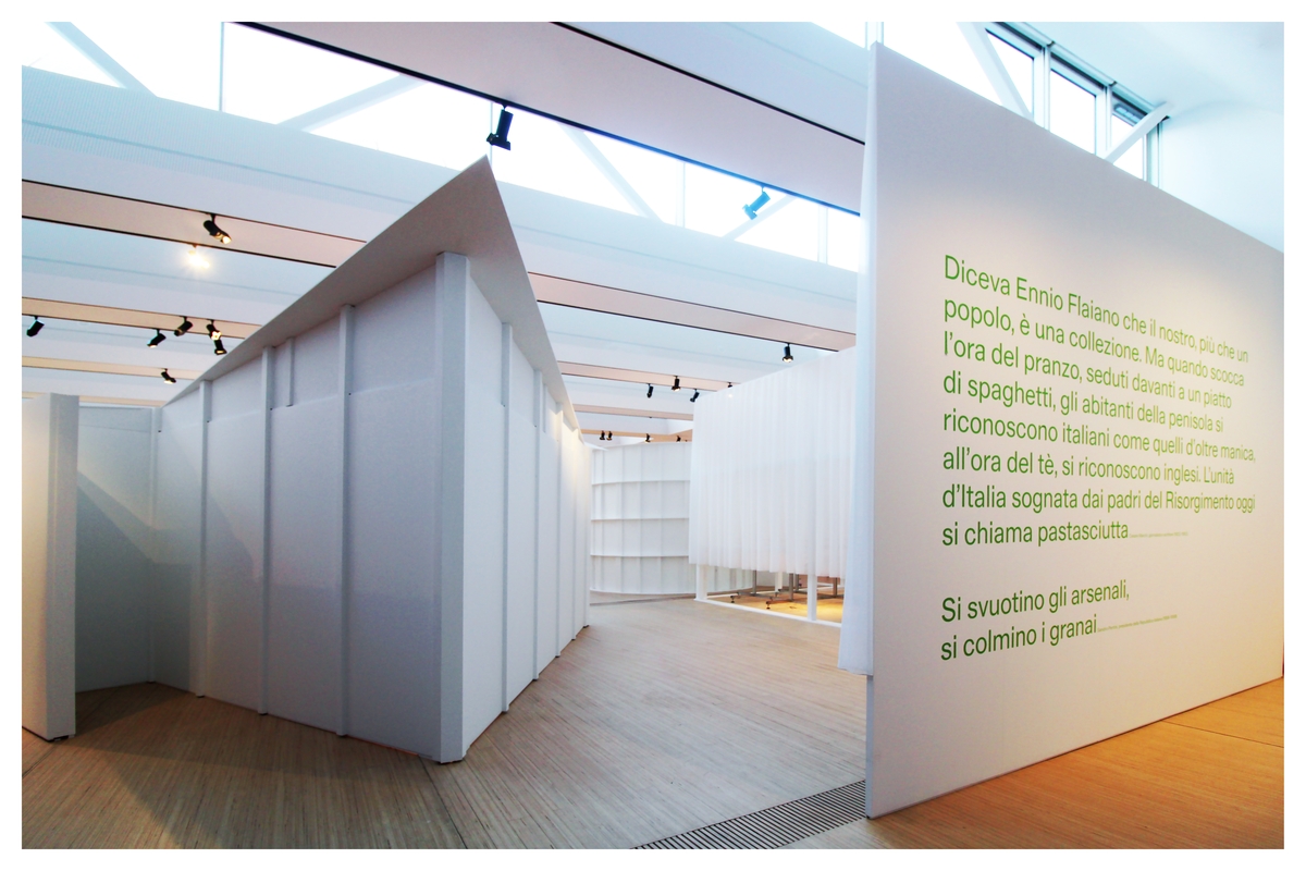 Gambardella Architetti si sono allora chiesti come nobilitare senza esaltare, come raccontare i prodotti (perché di prodotti si tratta) senza scadere nell’adulazione commerciale per di più vintage: in definitiva come narrare il gusto con gusto. La scelta allora è quella di realizzare dei veri e propri padiglioni, ognuno dalla forma diversa, il cui materiale però è lo stesso: tavole riciclate in legno, nervate e dipinte in bianco. Oltre che per la loro forma i padiglioni si distinguono per come finiscono i pannelli, con delle cimase che mimano alcuni motivi decorativi dell’architettura storica. Il risultato è che ci aggiriamo per una città in miniatura, o meglio in un modello di città ingrandito a scala umana. All’interno i padiglioni ospitano con discrezione le diverse sezioni in cui la mostra è articolata per darci l’idea di un gusto, quello italiano, che varia al variare continuo del suo territorio ed è variato nel tempo, tenendo però costanti determinati caratteri.