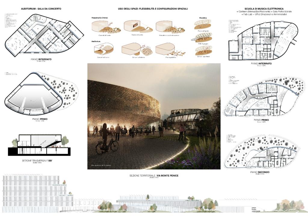 Spiegando le peculiarità del progetto vincitore, l’architetto Lorenzo Albai di studio Settanta7 è ricorso a una metafora inequivocabile: quella delle “foglie d’autunno che volteggiano nel vento”. È questa l’immagine chiave del concept del Bosco della Musica che, una volta ultimato, sarà il risultato del recupero di forma, volumetrie e prospetti esterni in mattoni della Palazzina ‘‘ex Chimici” (attualmente in stato di abbandono e ultima memoria del passato industriale di Rogoredo), e dell’addizione di un sistema di padiglioni di nuova costruzione, rispondenti ai principi dell’architettura bioclimatica e, appunto, ispirati alle foglie. Come si precisa nella relazione tecnico-illustrativa, gli edifici del complesso “presentano linee curve, come foglie che alla caduta dall’albero vengono soffiate dal vento, creando dei movimenti dinamici in sequenza. La regolarità e la rigidità urbana dell’area d’intervento lasciano però il posto a spazi, forme creative, fluide, allo stesso tempo contemporanee, inclusive e attrattive per le nuove generazioni. Un disegno che riprende la forza del movimento del vento, con concavità che accentuano la fluidità degli spazi e la loro apertura al cambiamento, all’innovazione, alla creatività, alla musica e alla cultura contemporanea”.