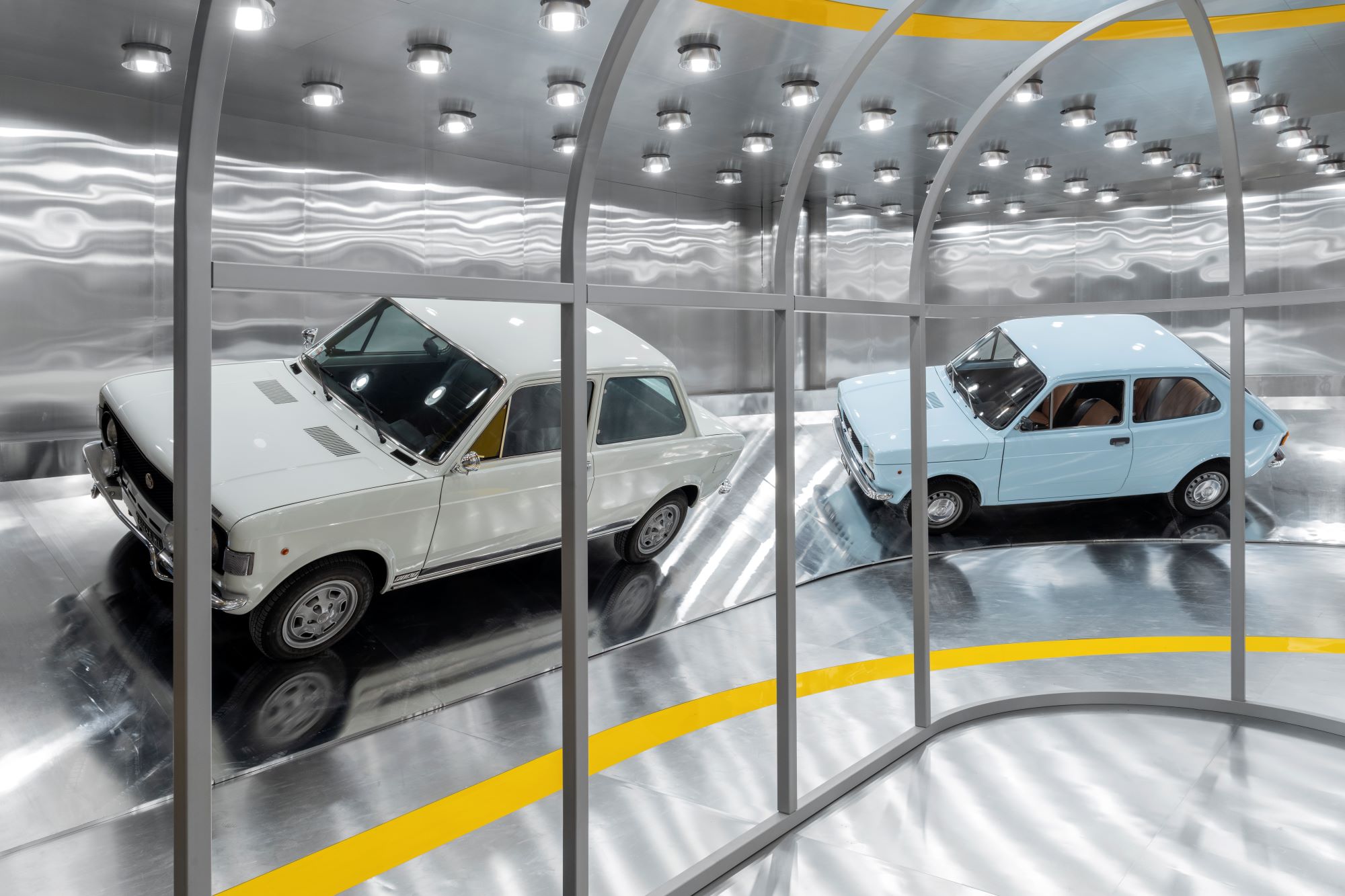 È possibile fare questo esercizio anche visitando la bella mostra alla Triennale. Lo sviluppo diagonale è forte nell’allestimento per lo showroom Olivetti di Buenos Aires (1968), con scale e gradoni che diventano piani di appoggio per gli oggetti esposti, mentre nel negozio FIAT di Zurigo (1973) il semplice accorgimento di appoggiare le automobili su pedane inclinate conferisce dinamicità all’intero spazio espositivo. Nella scenografia dell’Elektra di Richard Strauss per il Teatro alla Scala (1994) – anche questa realizzata alla Triennale in scala 1:1 – la griglia domina la scena fissa della macelleria e blocca movimenti che si sviluppano in uno spazio obbligato.