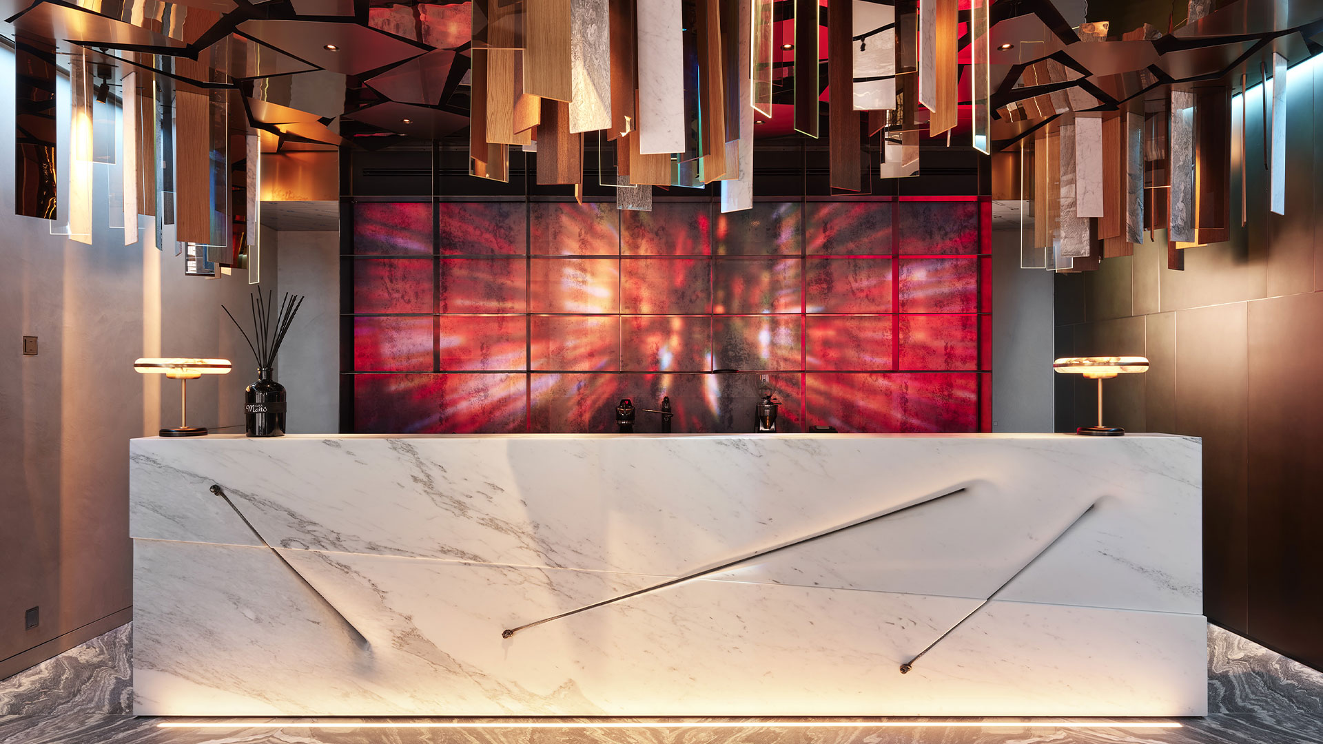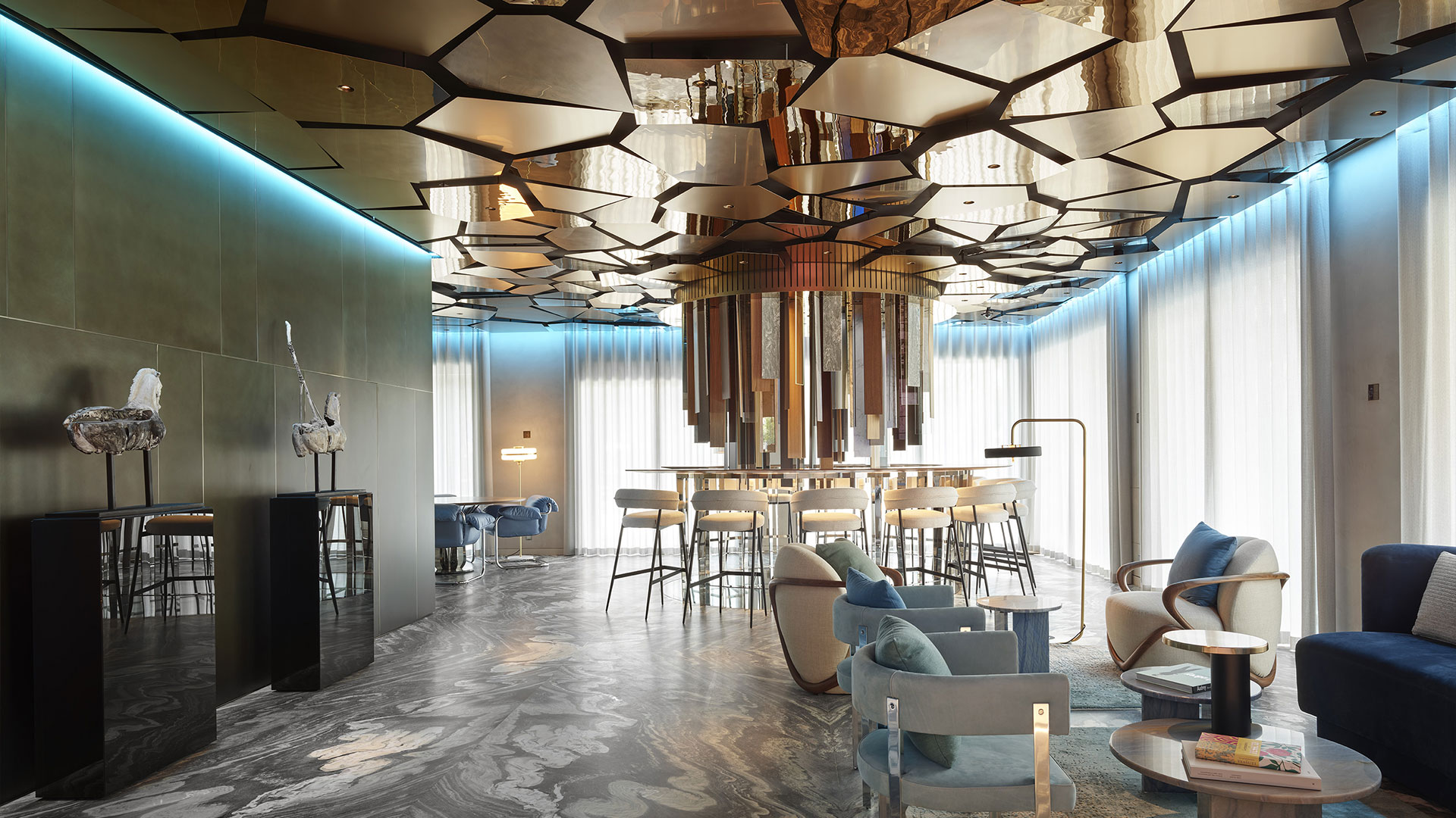 Tra gli elementi più scenografici, la scala che collega i piani ospita un’installazione artistica di Gustavo Vélez: in acciaio inox lucido, si estende dal piano terra fino all’ultimo piano, assumendo le sembianze di una fiamma. Ed è proprio l’arte contemporanea un altro elemento caratterizzante del progetto, sin dalla grande porta d’ingresso dove sono stati incastonati due pannelli neri, opera di Emilio Isgrò. All’interno il soffitto del piano terra è stato realizzato dall’artista bolognese Francesca Pasquali, che ha immaginato un’installazione di scaglie metalliche inclinate evocativo delle vibrazioni e dei riflessi della superficie del mare. Ma anche il bancone del bar è stato disegnato su misura dallo scultore armeno MIkayel Ohanjanyan, con cavi d’acciaio che attraversano un blocco di marmo tagliato. Mentre le foto di Massimo Listri sono esposte in diversi ambienti dell’hotel, che si distingue anche per la preziosità dei materiali adottati per le finiture. Come i rivestimenti esterni in tarsie e gelosie di ceramica bianche, montate su telai metallici scorrevoli e ispirate ai motivi decorativi floreali del tardo Liberty; o il marmo verde che riveste la piscina; e il curioso espediente utilizzato per portare il mare nella suite presidenziale, dove il pavimento è realizzato attraverso una colata di resina trasparente che fissa la sabbia della spiaggia di Forte dei Marmi.