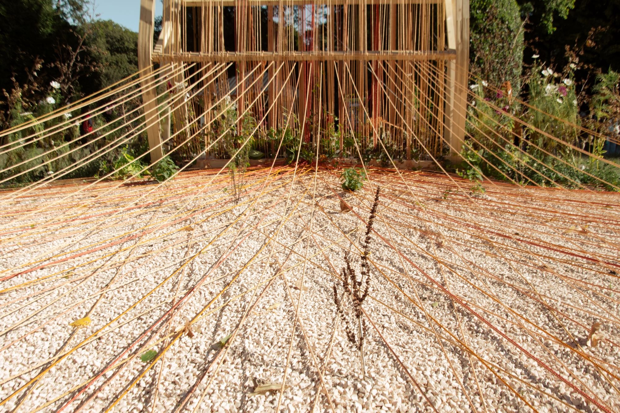 Fra i fili si intrecciano piante spontanee e ecologie secondarie come bardana, ortica, amaranto ed erba formaggio, specie spesso considerate erbacce ma portatrici di una forza autonoma e di una memoria ecologica. La bardana, in particolare, è stata scelta per il suo potere adesivo: la sua struttura naturale ha ispirato l’invenzione del velcro, un esempio straordinario di intelligenza biomimetica. Qui diventa elemento interattivo: i suoi capolini secchi, aderendo ai fili e ai visitatori, spargono semi e attivano un gesto di disseminazione naturale, trasformando l’opera in un organismo vivo e mutevole nel tempo. In questo senso, Understory riflette anche sul rapporto tra intelligenza naturale e artificiale. L’intelligenza vegetale, silenziosa, adattiva e cooperativa, offre un modello alternativo a quello algoritmico, suggerendo forme di apprendimento distribuito e non gerarchico.