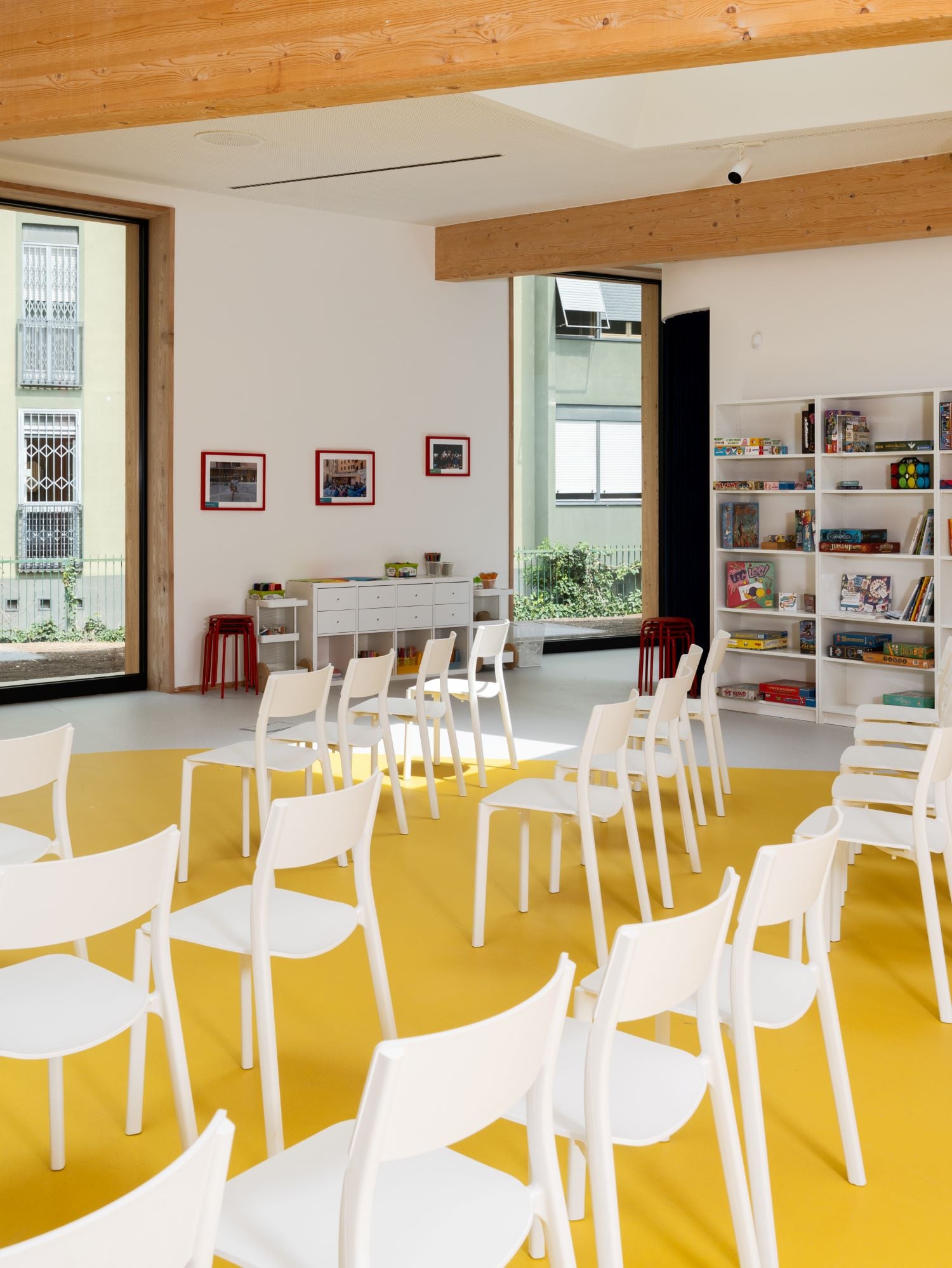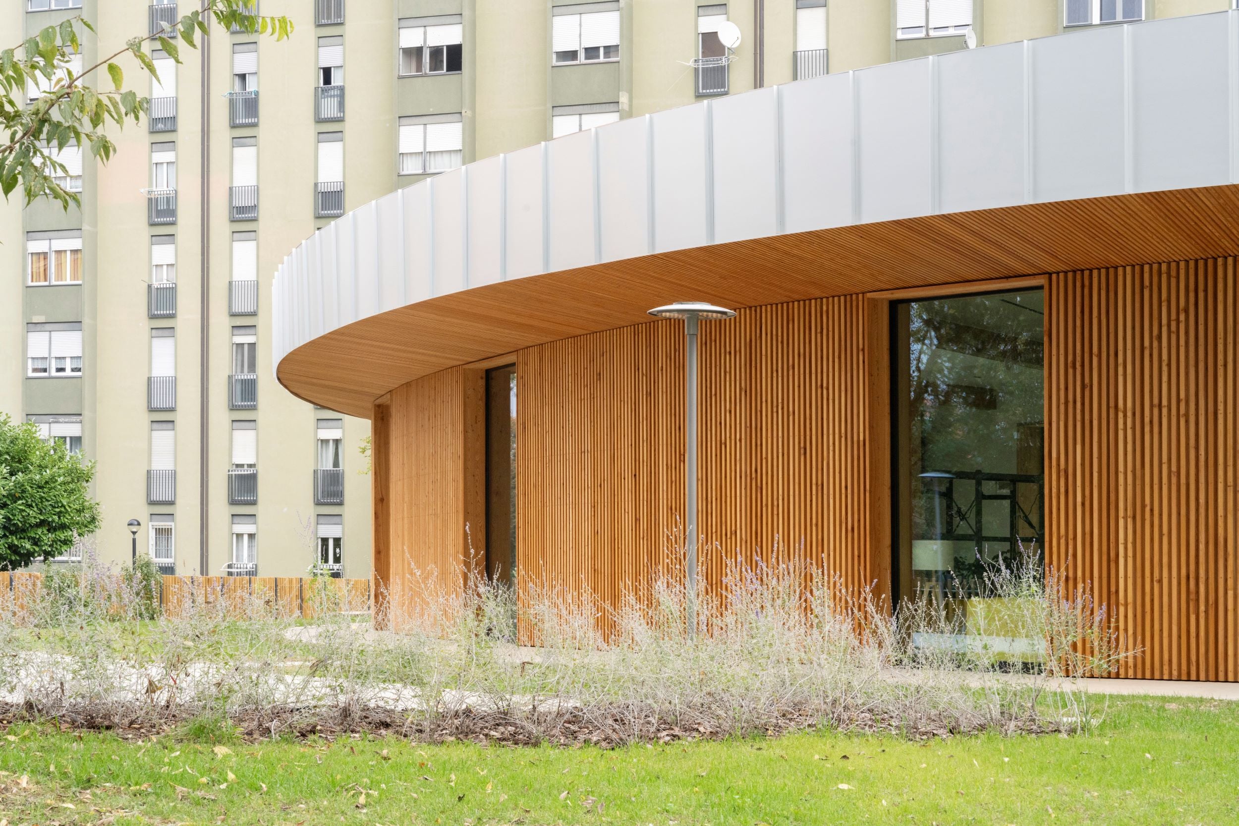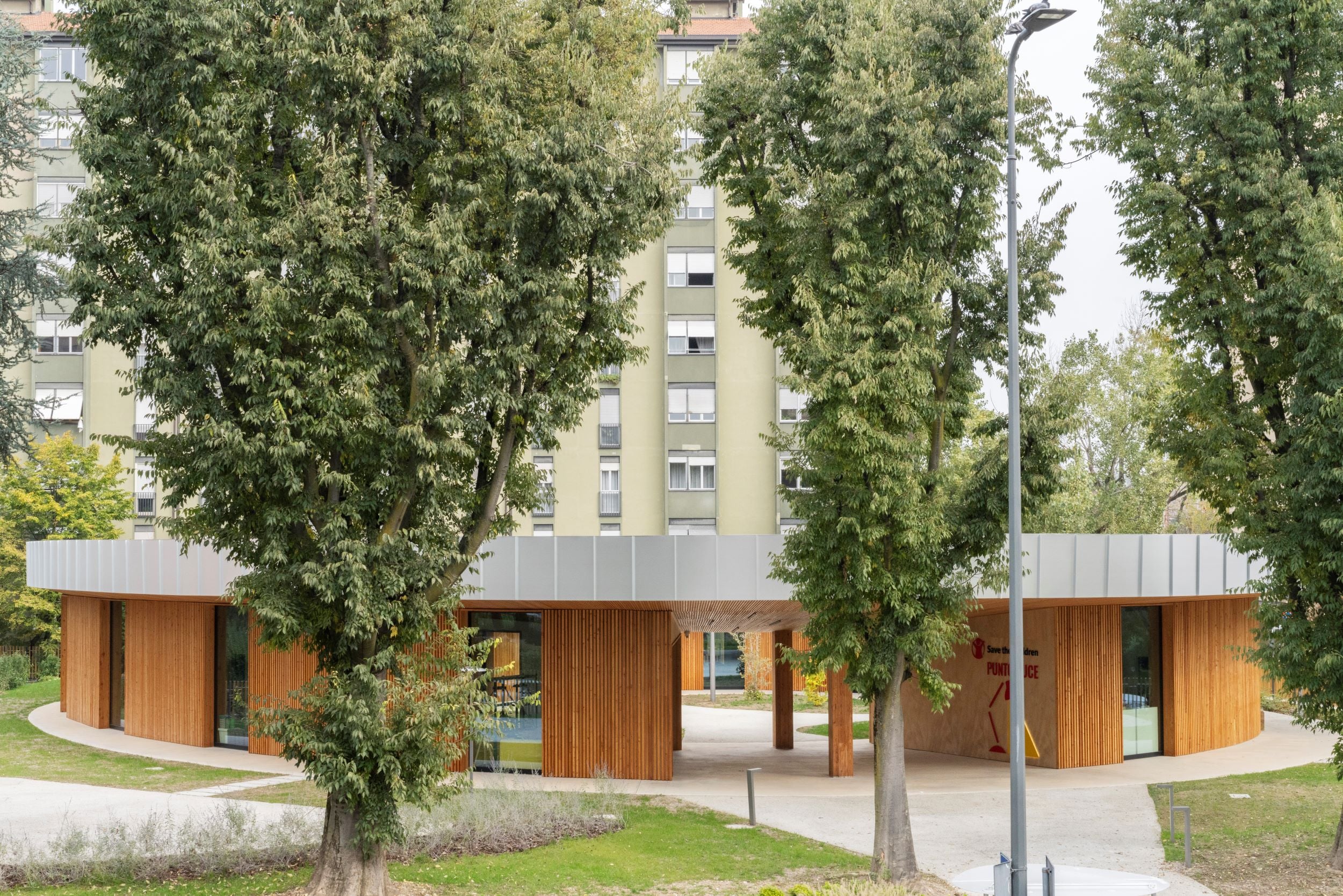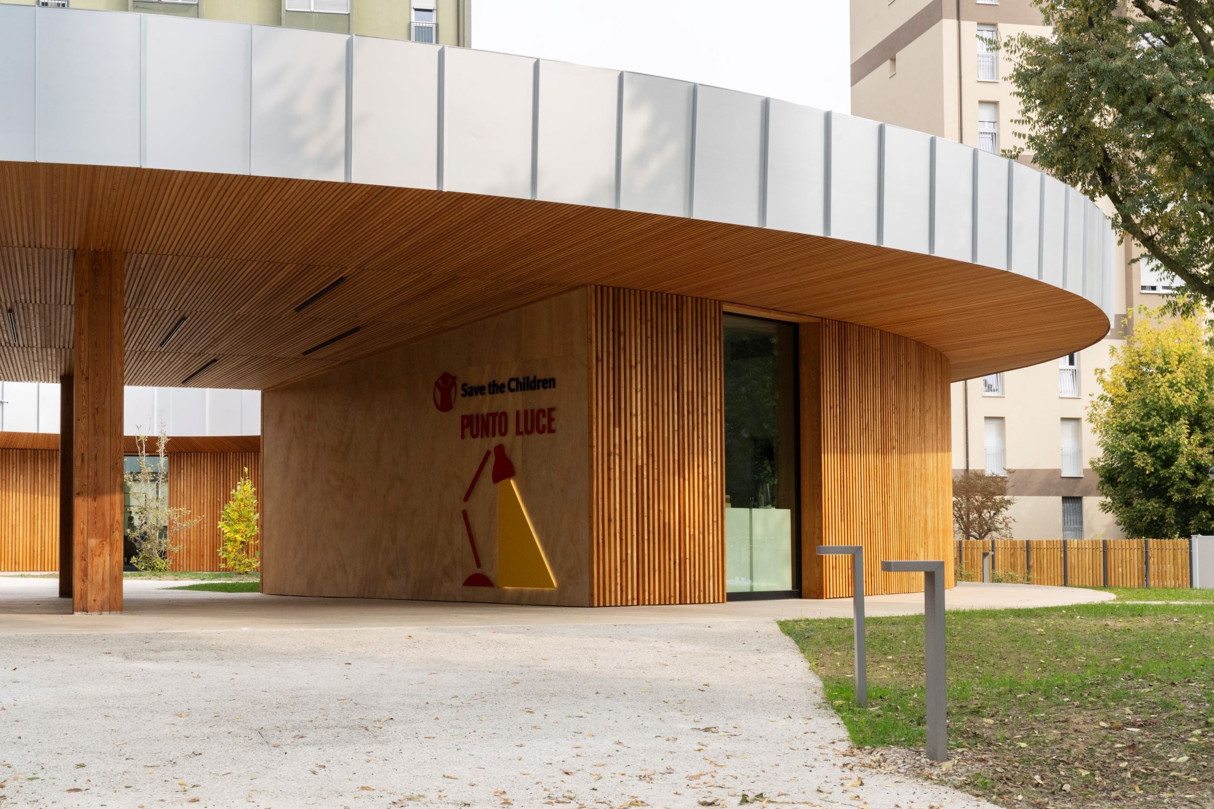 LA La struttura è completamente in legno, anche per dare un’immagine del tutto diversa rispetto alle soluzioni prefabbricate e in cemento della preesistenza. Punto Luce è coronato da un tetto verde che non vuole ammiccare in maniera superficiale ai temi della sostenibilità. Piuttosto abbiamo inteso la copertura come un quinto prospetto, una facciata in più per le persone le cui case affacciano sull’edificio, dopo anni in cui hanno visto ogni giorno il degrado. All’apparenza può sembrare introverso: in realtà è molto aperto rispetto a prima, ha un’accogliente forma circolare e una corte interna che, come pure gli interni, si presta a usi informali, non programmati.