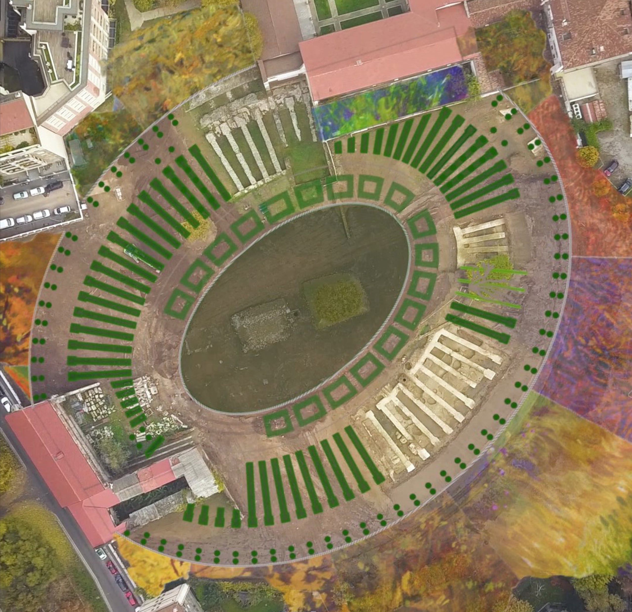 Il progetto PAN trasforma l’antico sito in uno dei più grandi parchi archeologici d’Europa. Poiché l’anfiteatro originale non può, per ovvie ragioni, essere ricostruito in altezza, il progetto riproduce la sua impronta attraverso rilievi del suolo e elementi vegetali. Dove mancano le fondazioni, siepi di bosso e altre piante tracciano i contorni originari. La pavimentazione della “nuova arena” è realizzata con 60.000 ciocchi di robinia tagliati a dischetti di varie dimensioni, a simulare simbolicamente la sabbia romana. La zona centrale sarà inaugurata a primavera 2026, mentre le aree esterne, comprese quelle dedicate allo “Zodiaco” – a commemorazione degli animali un tempo uccisi nell’anfiteatro – saranno completate successivamente. Il progetto crea anche una grande cerniera urbana di 100.000 mq, collegando l’area delle Colonne di San Lorenzo, la basilica, il Parco delle Basiliche e Sant’Eustorgio. Con percorsi pedonali, aree museali, un bar, un ristorante e spazi per eventi, PAN trasformerà un’antica architettura marziale in un luogo di natura, cultura e socialità. “La Scala di Milano, vedendo il progetto, ha richiesto di realizzare una corsia orchestrale per due eventi l’anno: un’ulteriore metamorfosi interessante”, annuncia orgoglioso l’Architetto Stocchi.