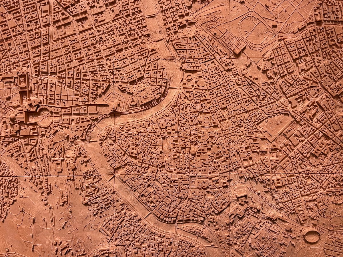 Nel percorso Dna di Roma, il territorio comunale è rappresentato attraverso Terracotta Rome, un modello fisico composto da 953 tessere, sul quale si anima un modello digitale dinamico che restituisce la complessità urbana e le sue trasformazioni nel tempo. Roma è uno dei comuni più estesi d’Europa ed è di gran lunga l’agglomerato urbano più popoloso d’Italia. Oggi quasi la totalità dei residenti vive oltre le antiche Mura Aureliane, che racchiudono appena l’1% della superficie comunale. Quando Roma divenne capitale d’Italia nel 1871, contava poco più di duecentomila abitanti; l’edificato si concentrava quasi interamente entro il perimetro delle mura. Oltre il 90% del costruito attuale è stato realizzato nel secondo dopoguerra, tra gli Anni Cinquanta e Settanta. Dagli Anni Ottanta, la progressiva trasformazione delle aree centrali in zone di servizi e uffici ha spinto parte della popolazione verso l’esterno. Ne è derivata una città discontinua e frammentata, a bassa densità, che si estende oltre il Grande Raccordo Anulare fino a lambire la campagna romana e il litorale.