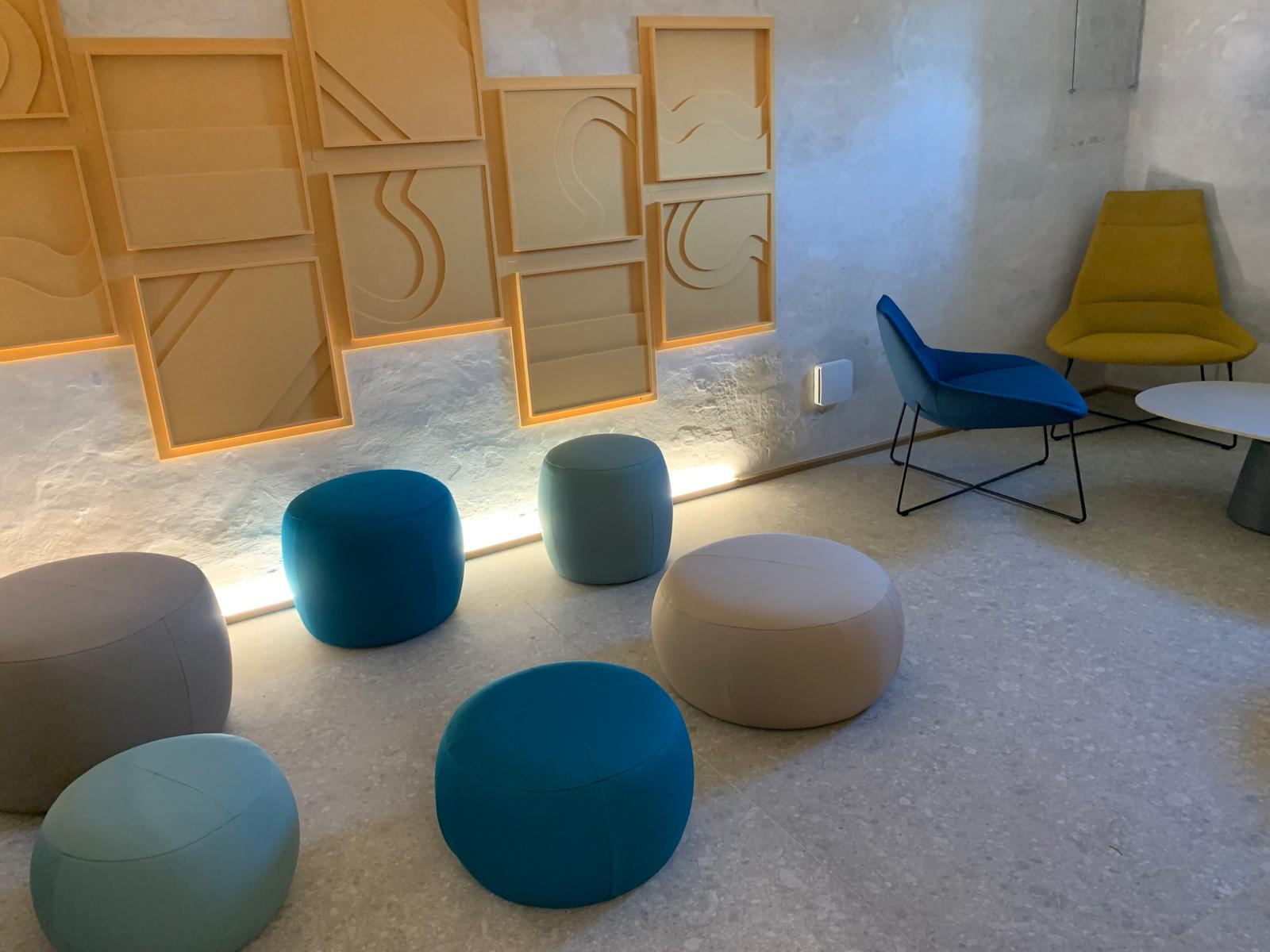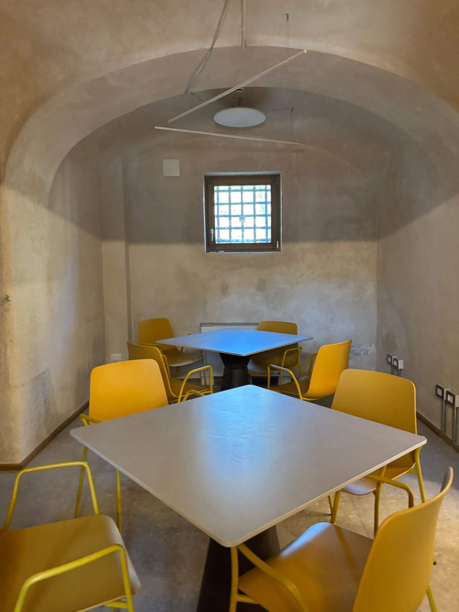Uno degli aspetti più significativi dell’intervento riguarda il rapporto tra l’identità storica dell’edificio e i nuovi elementi di arredo. Il progetto di recupero ha seguito infatti il principio del “minimo intervento”, mantenendo quanto più possibile la struttura originaria. Grate, porte delle celle e alcuni oggetti del passato sono stati conservati, così come le tracce lasciate dai detenuti sulle pareti: graffiti, scritte e frammenti di memoria che raccontano la storia silenziosa del luogo. All’interno di questo involucro austero si inserisce un arredo contemporaneo dai colori vivaci: tavoli e sedute in acciaio verniciato e polipropilene, poltrone e pouf informali, lavagne magnetiche e pannelli per esposizioni. Ogni stanza è identificata da una cromia diversa, pensata anche per facilitare l’orientamento degli studenti. A completare l’allestimento ci sono pannelli acustici modulari tridimensionali realizzati in PET riciclato, installati sulle pareti per migliorare il comfort degli ambienti. Il contrasto tra la severità delle murature ottocentesche e la leggerezza del design contemporaneo contribuisce a costruire una nuova identità per lo spazio.