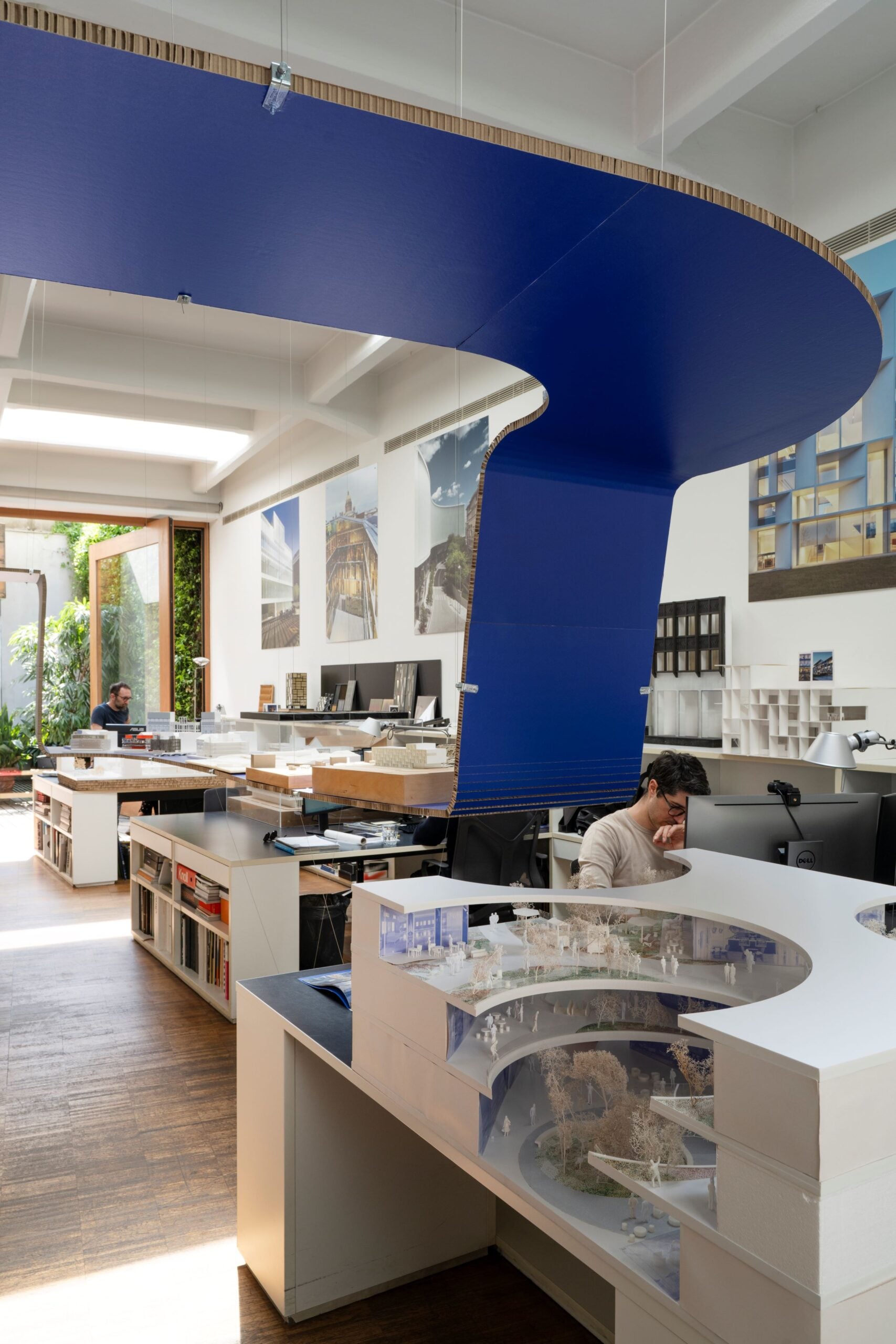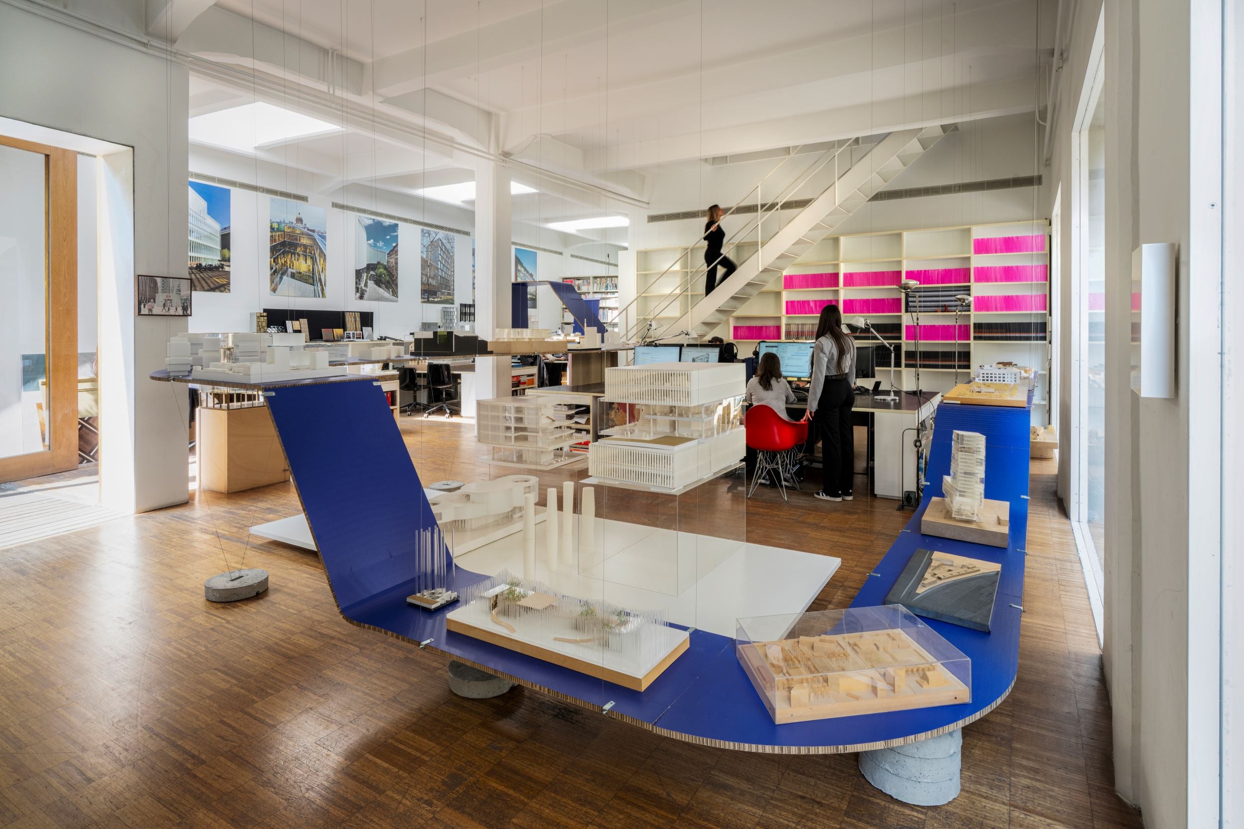 Per cinque giorni, in Via Palermo 5, nel quartiere Brera di Milano, un nastro blu ha abitato gli spazi dello studio di architettura Piuarch. Realizzato in materiale riciclabile, ha intercettato le postazioni di lavoro, con frequenti variazioni di direzione e quota; si è fatto notare anche dall’esterno, segnalando la sua presenza a ridosso delle vetrate di quello che un tempo era un magazzino. Sulla sua superficie una selezione di plastici ha ripercorso la storia – trentennale – della società fondata nel 1996 dagli architetti Francesco Fresa, Germán Fuenmayor, Gino Garbellini e Monica Tricario. “Sono pochi gli studi di architettura composti da quattro soci, di solito prevalgono le coppie. È un numero che ricorda i gruppi musicali” racconta Fresa ad Artribune. E, a proposito della mostra temporanea PIU30, aggiunge che “ha attraversato metaforicamente tutti i periodi della nostra attività e tutto lo studio, un luogo che ci appartiene e ci piace molto. Qui siamo riusciti a costruire quella che considero come una comunità, in cui si combinano punti di vista e culture”.