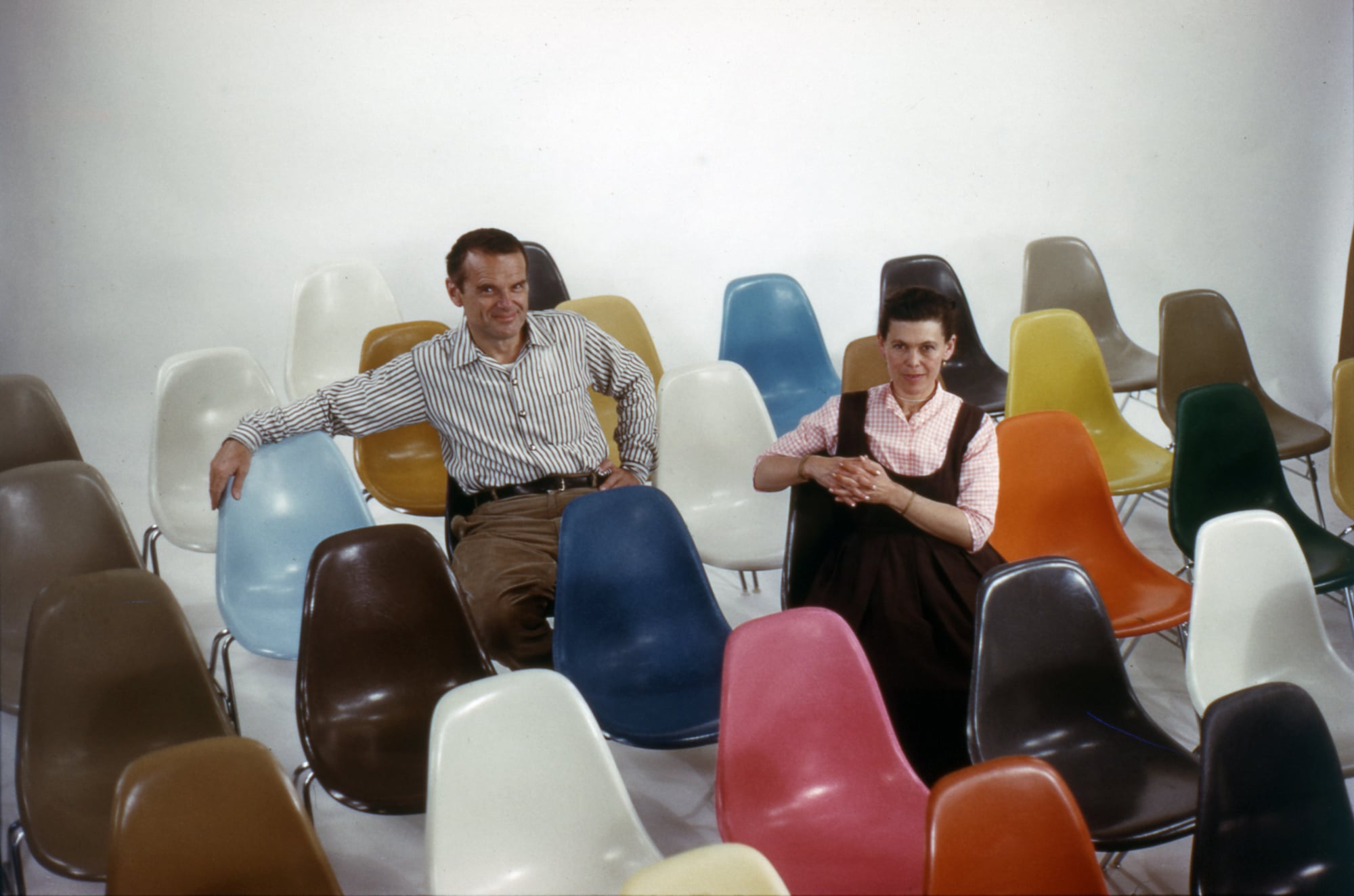 Architetto lui, anche se non laureato e mai abilitato alla professione, artista lei, allieva di Hans Hofmann e figura di primo piano dell’espressionismo astratto americano, Charles e Ray Eames si incontrano in Michigan, alla Cranbrook Academy of Art di Bloomfield Hills, alla fine degli Anni Trenta e si sposano nel 1941. Nasce così, da un incontro percepito da entrambi come una specie di chiamata e dall’unione di due talenti diversi ma complementari, una delle coppie più famose della storia del design, che lavorerà a quattro mani per raggiungere un obiettivo condensato nel famosissimo slogan “make the best for the most at the least” (fare il meglio per il maggior numero di persone al minor costo possibile): dare alla nuova classe media suburbana in piena esplosione, anche demografica, oggetti di buona qualità, intelligenti e accessibili. Il loro è un funzionalismo per niente rigido, giocoso, che procede per prove ed errori avvalendosi anche di strumenti poco convenzionali come la Kazam! Machine, una macchina artigianale capace di piegare il compensato grazie alla pressione fornita da una pompa per bicicletta.