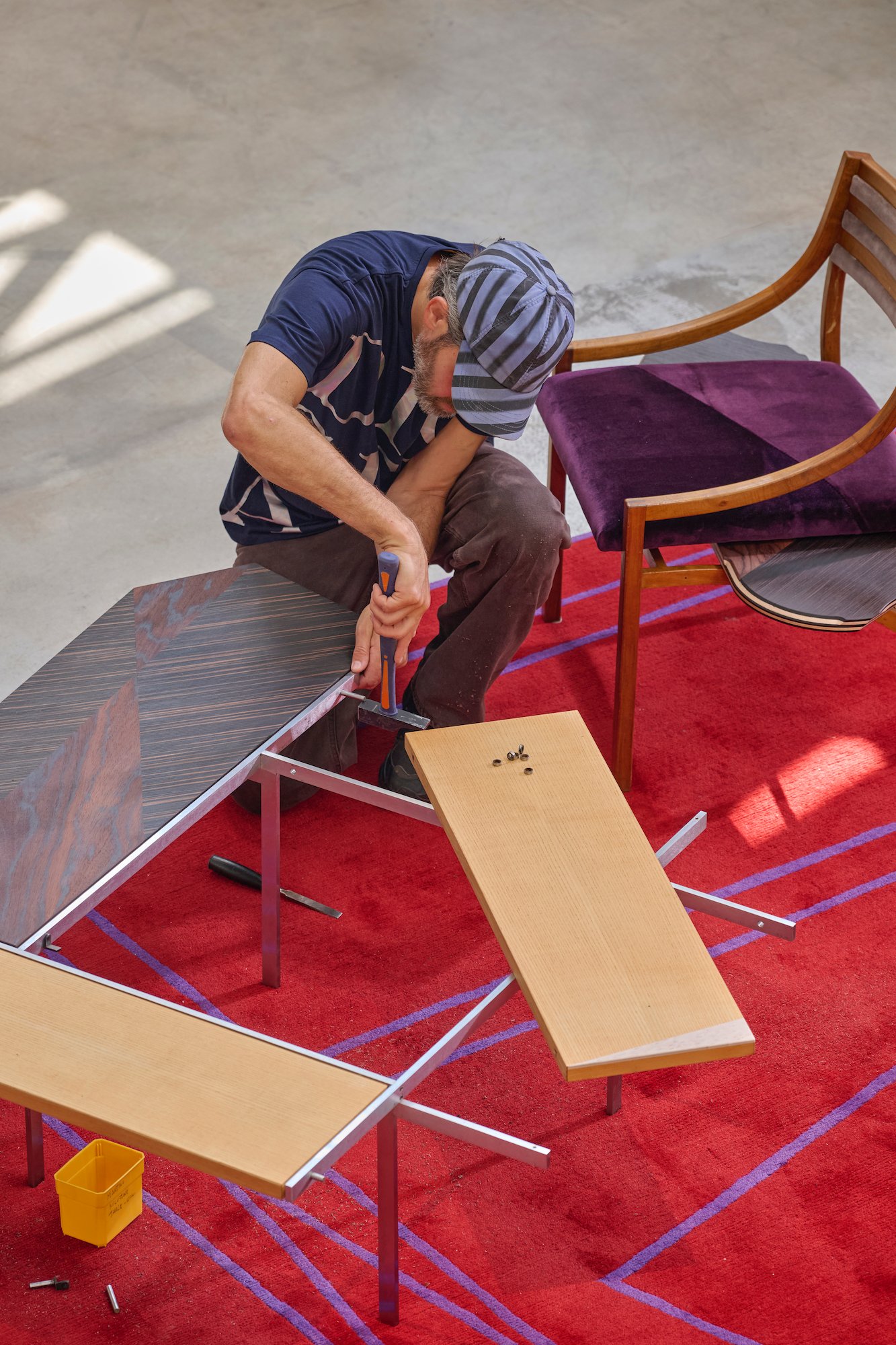 All’inizio di ottobre, per festeggiare i dieci anni del Depot, Nina Yashar ha chiamato un suo grande amico, Martino Gamper, a effettuare una performance nell’atrio. Il designer altoatesino ha decostruito sotto lo sguardo dei visitatori una serie di arredi mid-Century, tra cui le testiere Positano di Ico Parisi e il letto LT29 di Franco Albini e Franca Helg, e ha riconfigurato i loro pezzi dando vita a nuove opere, con l’aggiunta di pannelli in legno composito. “Ho conosciuto Martino grazie a Ron Arad, che mi parlò di un suo ex studente a Londra che aveva un approccio molto personale al design”, ricorda ancora Yashar. “Andai a vedere il suo lavoro e fu una scoperta davvero speciale per me, soprattutto per la sua capacità di destrutturare e ricomporre forme con una leggerezza solo apparente, quasi rituale. In quegli anni stava portando avanti il progetto «100 Chairs in 100 Days», un’idea che rompeva del tutto le regole del design, sia con gioia che con rigore”. Correva l’anno 2007 e Gamper stava realizzando cento sedie-Frankenstein, una al giorno, assemblando pezzi provenienti da altre sedie di recupero nell’ambito di un’esperienza pionieristica di design circolare. “Quel primo incontro ha dato subito vita a un dialogo creativo molto fluido, che è cresciuto nel tempo. Quando nel 2015 abbiamo inaugurato Nilufar Depot, chiesi proprio a lui di immaginare un intervento che potesse dare una voce forte e non convenzionale a quel nuovo spazio. Per l’occasione realizzò un’installazione site-specific composta da oltre 150 sedute per la cena inaugurale. Un gesto molto potente, che ha segnato l’identità del Depot fin dal primo giorno”.