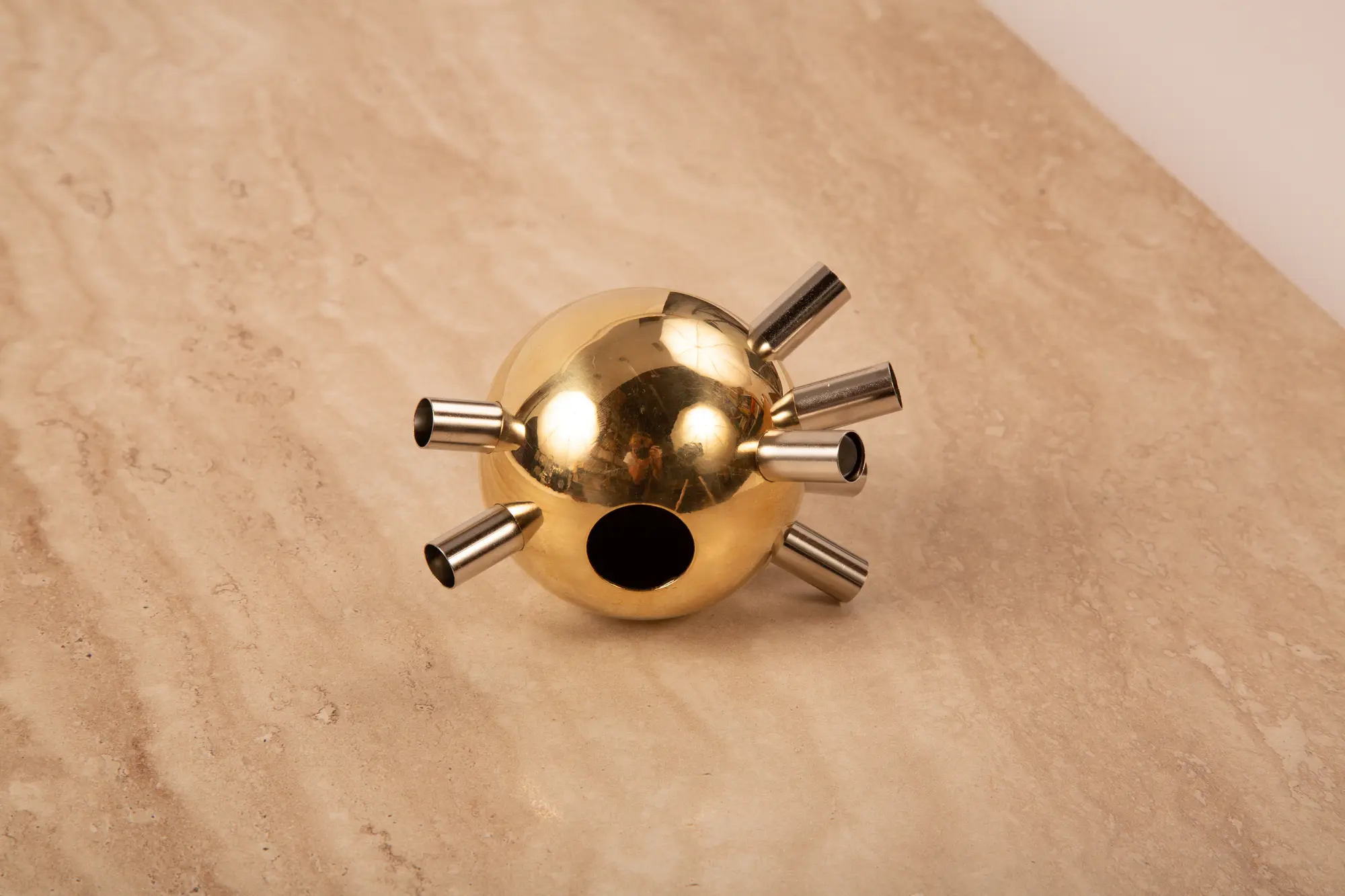 Ancora a proposito di borse, su un altro registro si colloca la Orb Bag, realizzata in acciaio cromato, bianco e nero, stavolta non la versione deluxe di un prodotto da supermercato, ma un oggetto futuristico che si ispira alle ciclidi di Dupin, superfici algebriche definite come l’inversione di un toro geometrico, un cilindro o un cono: protagoniste sono dunque le linee di curvatura spaziali e la relativa deformazione della luce. Realizzate in acrilico e rivestite in lucida pelle, assomigliano a delle sculture in miniatura di Anish Kapoor. Piccole come amuleti e simili a luccicanti toys sono invece le Ball Harp, strumenti musicali in acciaio e ottone, realizzati decostruendo e riplasmando in una inedita forma sferica l’armonica a bocca.