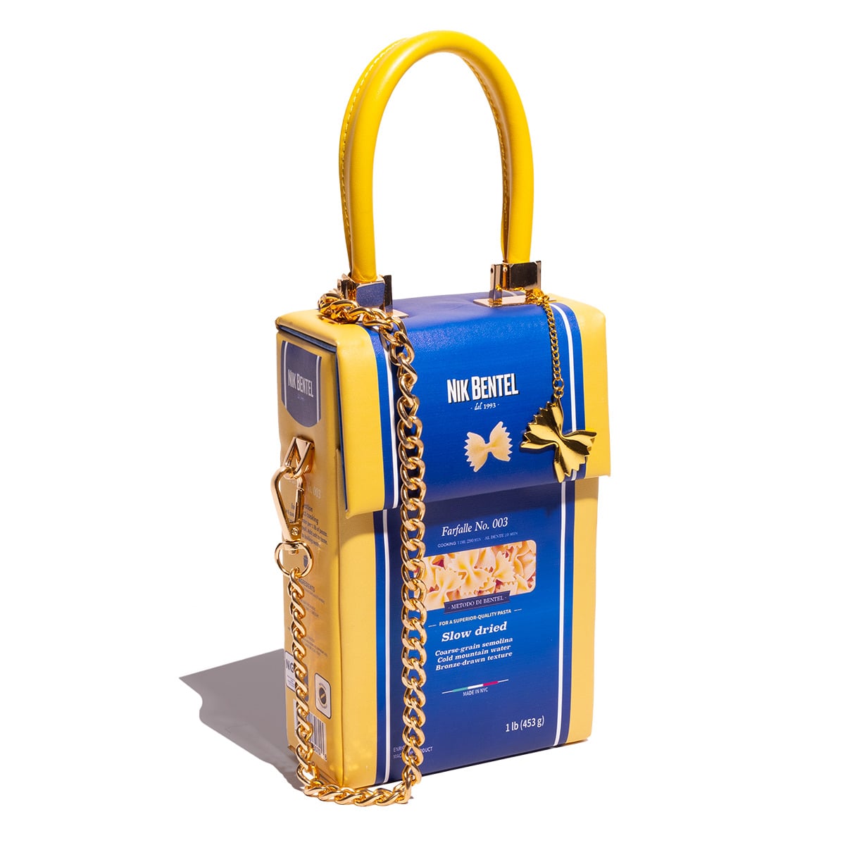 Ben fatta la campagna di comunicazione, animata da una serie di scatti divertenti, coloratissimi, un po’ naïf, sempre sul focus “frutta e ortaggi”: piogge di arance, cavolfiori, mele, sedani, banane, tra ceste ricolme e ragazzi che volteggiano nel vuoto, agganciati alle le loro bag. L’approccio di Bentel è inconfondibile. Basta scorrere il suo sito: struttura minimal, palette accesa e un’identità visiva fortissima (firmata da Little Troop). Uno humor che si nutre di leggerezza e di un’idea del vintage sdrammatizzata, non romantica, tra logotipo e faccine-mascotte animati, a evocare grafiche, font e cartoon Anni ‘70/‘80.Quanto ai prodotti lanciati di recente, sono in perfetta continuità con l’operazione Lidl la Spaghetti Clutch e la Pasta Bag, borsette in pelle vegana con stampa UV, costruite esattamente come delle confezioni di pasta: finto marchio vintage, in stile ‘antico pastificio d’epoca’, colore blu Barilla – Bentel è di origini italiane – catena in acciaio dorato e tutti i dettagli perfettamente riportati, dal numero del formato al peso, dal codice a barre alle indicazioni sul tipo di grano o sulla cottura. Costo: tra i 275 e i 320 dollari.