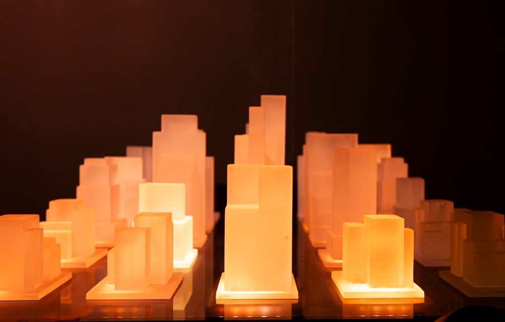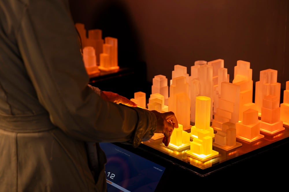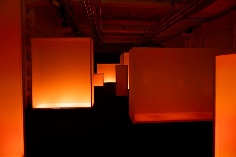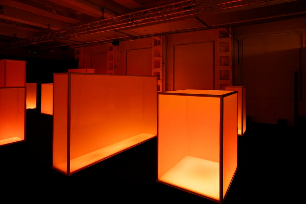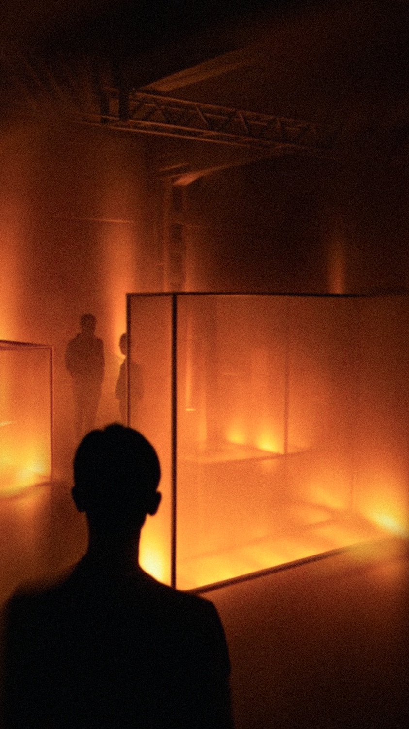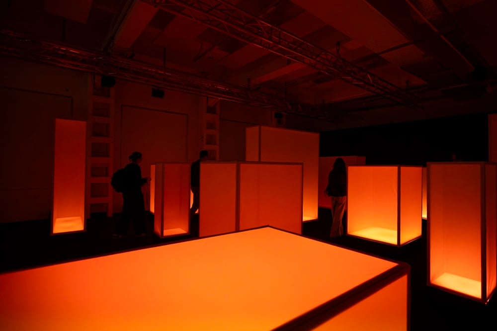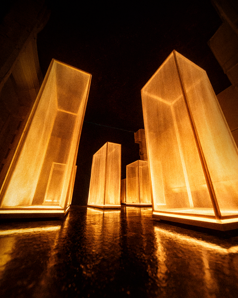 “L’installazione si articola intorno a diciassette elementi audio-luminosi distribuiti nello spazio che creano un’astrazione urbana di un paesaggio sonoro”, spiega Davide Carioni, in arte Asker, co-fondatore di WOA Studio. “Questo ci ha permesso di creare un audio immersivo dove la luce reagisce agli impulsi sonori, guidando l’utente attraverso un percorso in tre atti: Caos, Armonia e Quiete. Anche il design formale degli elementi è dettato dal suono: le loro dimensioni e geometrie rispecchiano le frequenze emesse. Per quanto riguarda la composizione audio, abbiamo fatto una ricerca sul campo. Partendo dai rumori urbani, in particolare dal rollio dei pneumatici, abbiamo lavorato di sintesi con l’obiettivo di depurare l’inquinamento sonoro, armonizzandolo progressivamente e riconducendolo alla sua essenza più intima: un battito cardiaco che segna il momento della quiete finale”.