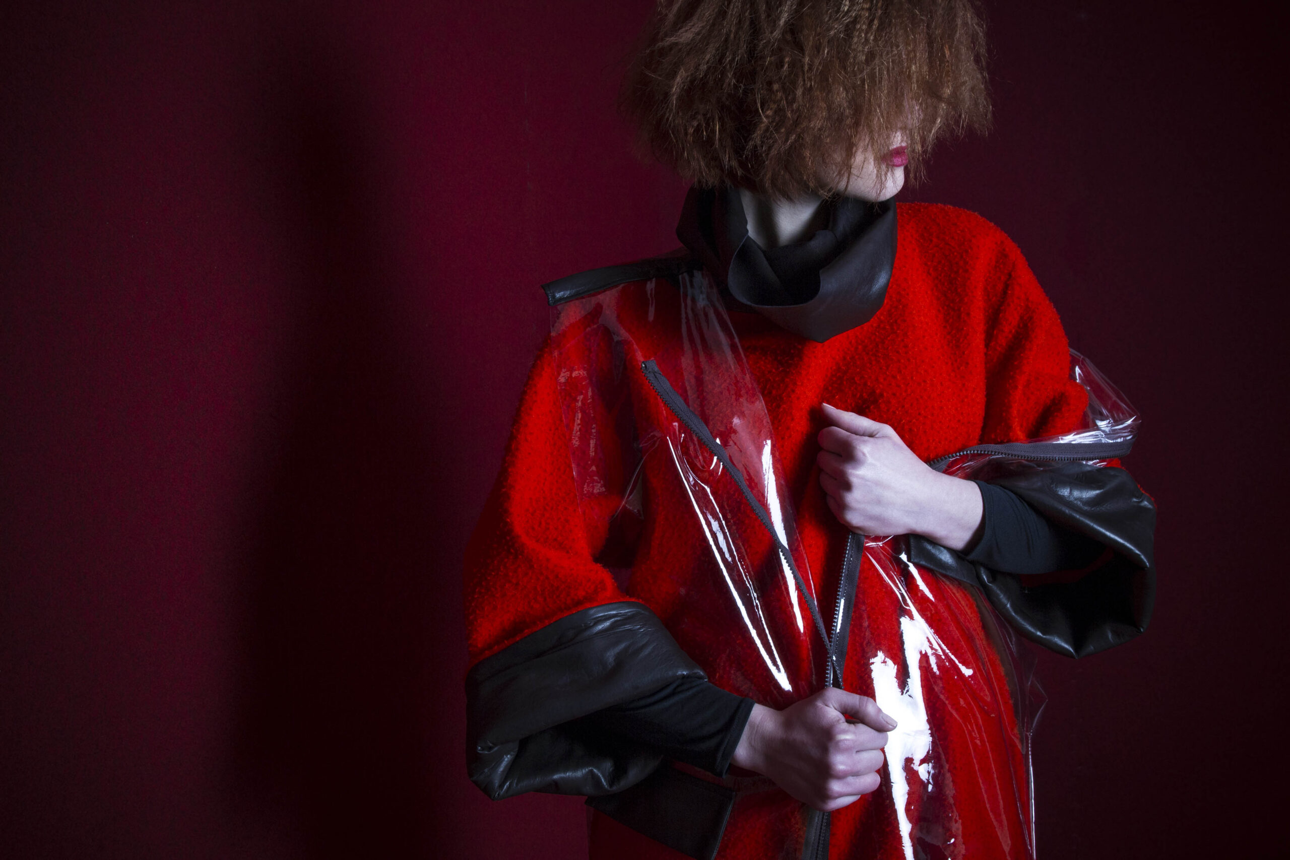 La mini collezione Camera Red si compone di tre capi, ognuno dedicato alla figura di un artista contemporaneo. C’è il cappotto Burri, ispirato alle celebri Plastiche, con tutta la grazia e la violenza delle combustioni e delle modulazioni materiche informali. Tre strati, indossabili separatamente oppure da combinare insieme, come a costruire un’architettura di forme e di piani: una candida tunica senza maniche di lino acetato, chiusa sul retro da una fila di bottoni; un paltò in casentino rosso, con inserti in pelle su collo e maniche, dotato di un solo foro all’altezza del collo; un impermeabile senza maniche in PVC kristal, con finiture in pelle e zip centrale.
