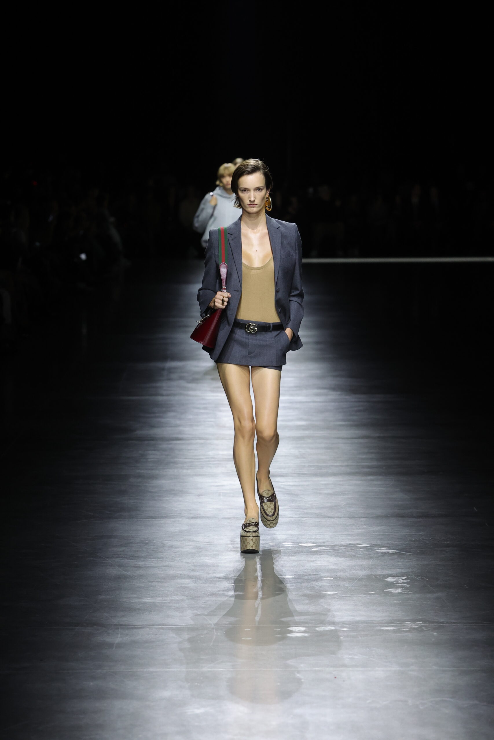 La risposta è arrivata sin dal look di apertura della nuova collezione, composto da pantaloncini, cappotto e canotta con scollo profondo, in cui gli unici “eccessi” erano una cintura nera con il logo delle doppie G, una borsa Jackie bordeaux en pendant con i mocassini dalla para vertiginosa, e una collana la cui sobrietà sta negli anelli dorati che si intersecano. Il défilé è una sfilza di blazer con pelle nuda al posto della camicia, tutine logate come vuole l’archivio di Gucci, denim, felpe con o senza zip, caban, tutine in maglia e capispalla a quattro e non cinque tasche. Il giorno poi fa spazio alla sera, e ai suoi abitini con pizzi sottili e trasparenti, altri luminosi e corti, oppure semplicemente neri e squadrati.