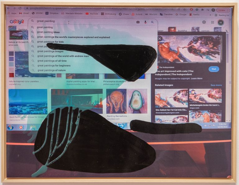 La mostra Searching for Art dà l’opportunità di riflettere sui nostri meccanismi di pensiero e sulla loro relazione con internet, che ha notevolmente cambiato le nostre vite, ma anche sul nostro modo di formulare domande, cercare risposte, e i limiti che esistono tra realtà e finzione, tra una notizia vera e una notizia falsa, tra un’opera d’arte e una semplice immagine. La questione della popolarità viene per esempio affrontata con la storia dell’uovo Eugene, l’immagine di un uovo su fondo bianco pubblicata nel 2019 sul profilo world record egg dal creativo Chris Godfrey senza troppe spiegazioni e che in maniera totalmente inaspettata ha raggiunto quasi 5 milioni di follower e oltre 55 milioni di cuoricini. Oppure i meccanismi dell’autocomplete che offrono risposte prima ancora che si pongano domande e che vengono qui applicati alla percezione dell’arte contemporanea, che diventa però qui solo lo specchio di un fenomeno più complesso. L’opera How to make a painting? è emblematica in questo senso. L’artista pone a Google dei quesiti, ad esempio la questione di cosa è no un capolavoro. La risposta è sorprendente: il Giudizio Universale di Michelangelo ospita un gatto. L’Urlo di Munch diventa un avocado. Ecco le immagini.