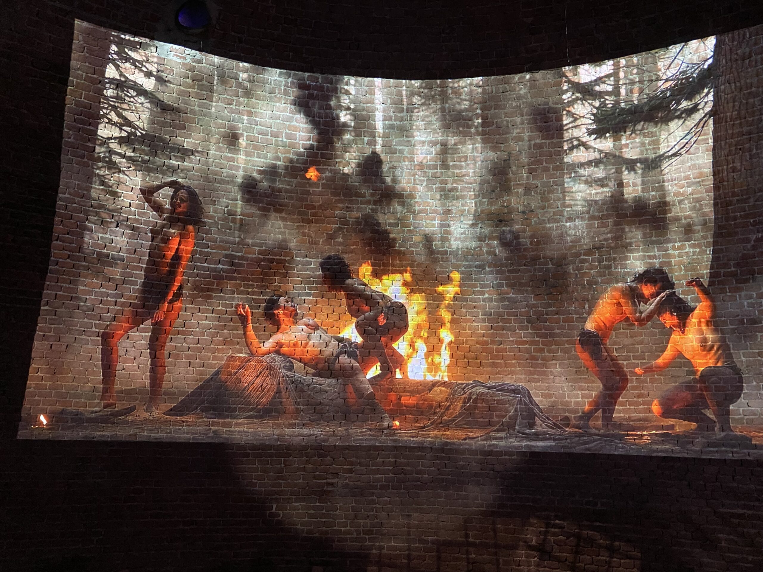 Visitabile fino al 3 novembre, Clash, Triumph, Decadence si compone di una videoinstallazione eponima che, dividendosi in tre frammenti distinti, occupa le pareti dell’intero spazio. Al centro dell’opera vi è il genere umano che, dalla preistoria fino a un futuro lontano ma non troppo fantasioso, compie un viaggio perpetuo nel quale rivela continuamente la propria natura creatrice e distruttrice allo stesso tempo. Realizzata in collaborazione con il Creative Technologist e Product Designer Nico Angelone, l’opera si è valsa anche di un’Intelligenza Artificiale addestrata per riconoscere e intervenire graficamente sui corpi dei ballerini e delle ballerine presenti nei video. Una sorta di tableaux vivants messi in scena per raccontare evoluzioni e perseveranze della nostra specie senza offrire però sguardi capaci di andare oltre quanto descritto dal titolo (ovvero i concetti di conflitto, trionfo e decadenza). E se nel complesso l’opera può avere obbiettivamente una sua forza formale, purtroppo non si può dire lo stesso dell’aspetto concettuale. Alquanto didascalico e ridondante, il lavoro sembra infatti fermarsi soltanto alla superficie facendo espressamente leva sulla spettacolarità della tecnologia adoperata nonché dell’ambiente stesso.