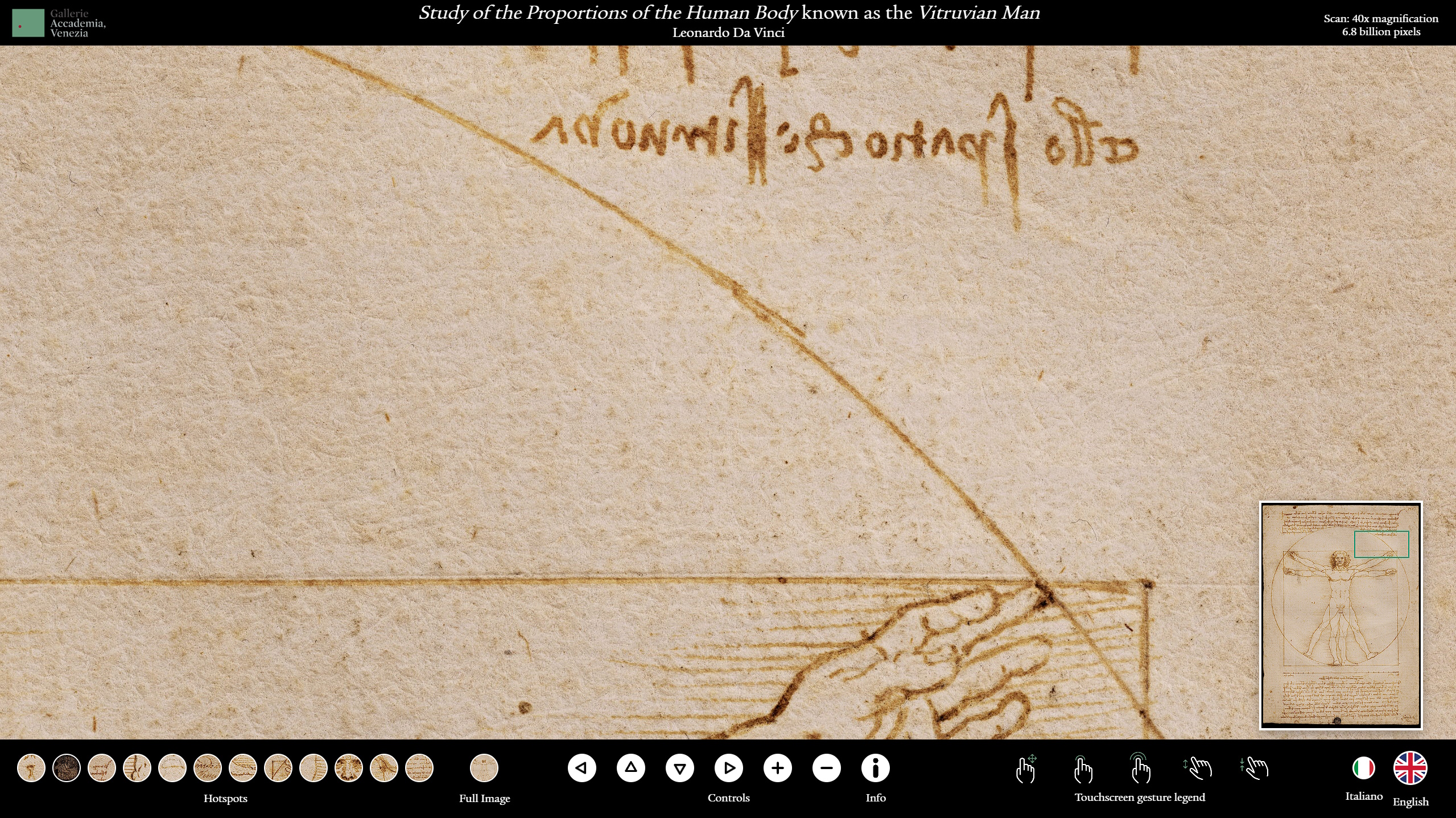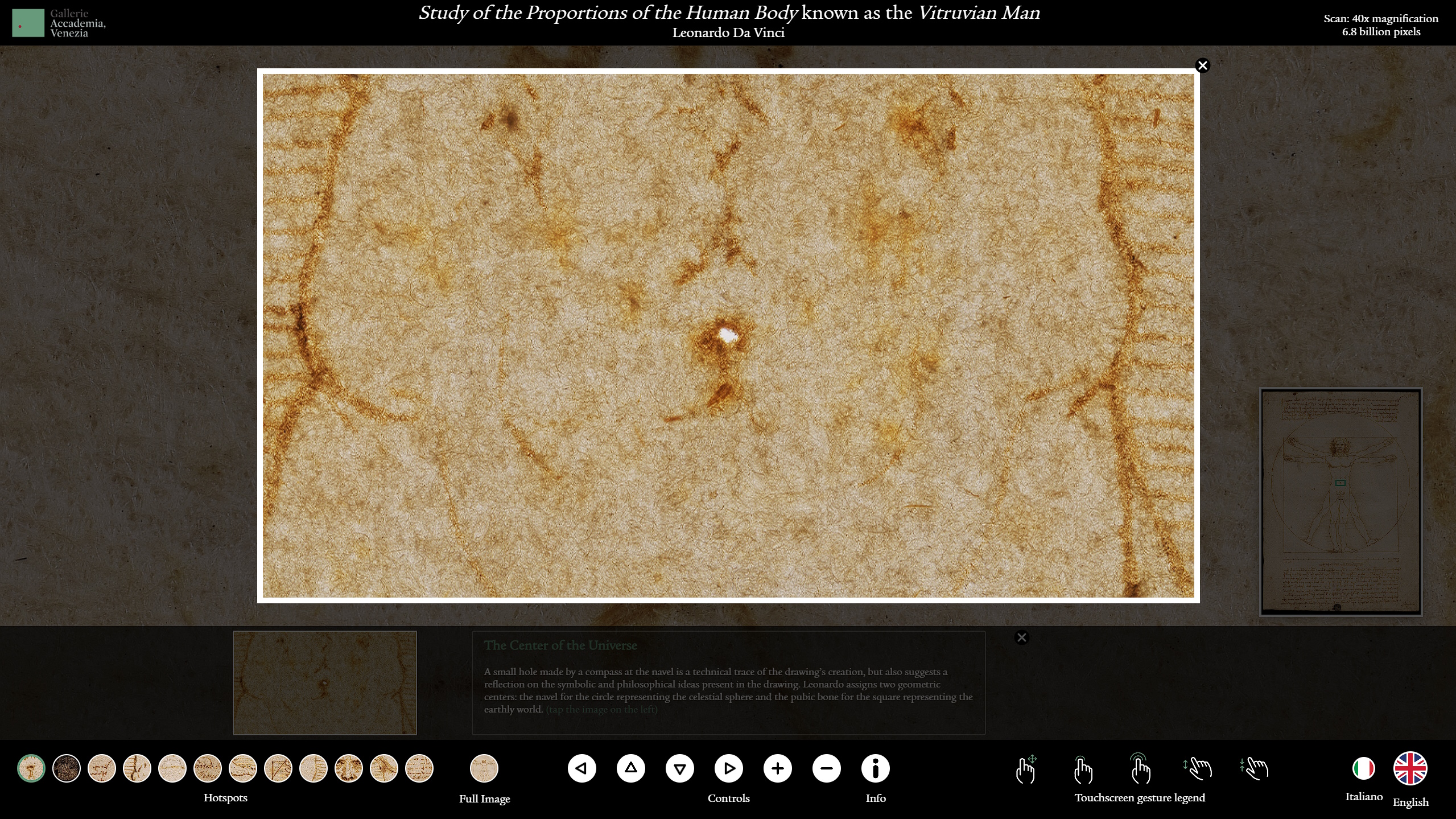 Come sostengono i coordinatori dell’allestimento Maria Antonietta De Vivo (curatrice anche del progetto architettonico) e Stefano Volpin, responsabile della direzione scientifica dello Spazio Multimediale, queste immagini non solo “consentono di vedere particolari altrimenti invisibili, indispensabili per la conoscenza della struttura, delle tecniche esecutive e per la valutazione dello stato di conservazione delle opere”, ma permettono anche di ricostruire la storia dell’opera dopo la realizzazione dell’artista. Le analisi sul disegno di Leonardo Da Vinci, hanno infatti dimostrato l’esistenza lungo il contorno della figura di un solco eseguito sopra il tratto a inchiostro, un segno non funzionale alla costruzione del disegno, eseguito probabilmente per ottenerne un calco in un momento successivo. Lungo tale tracciato la carta ha subito una pressione molto forte tanto da essere indebolita e particolarmente fragile.