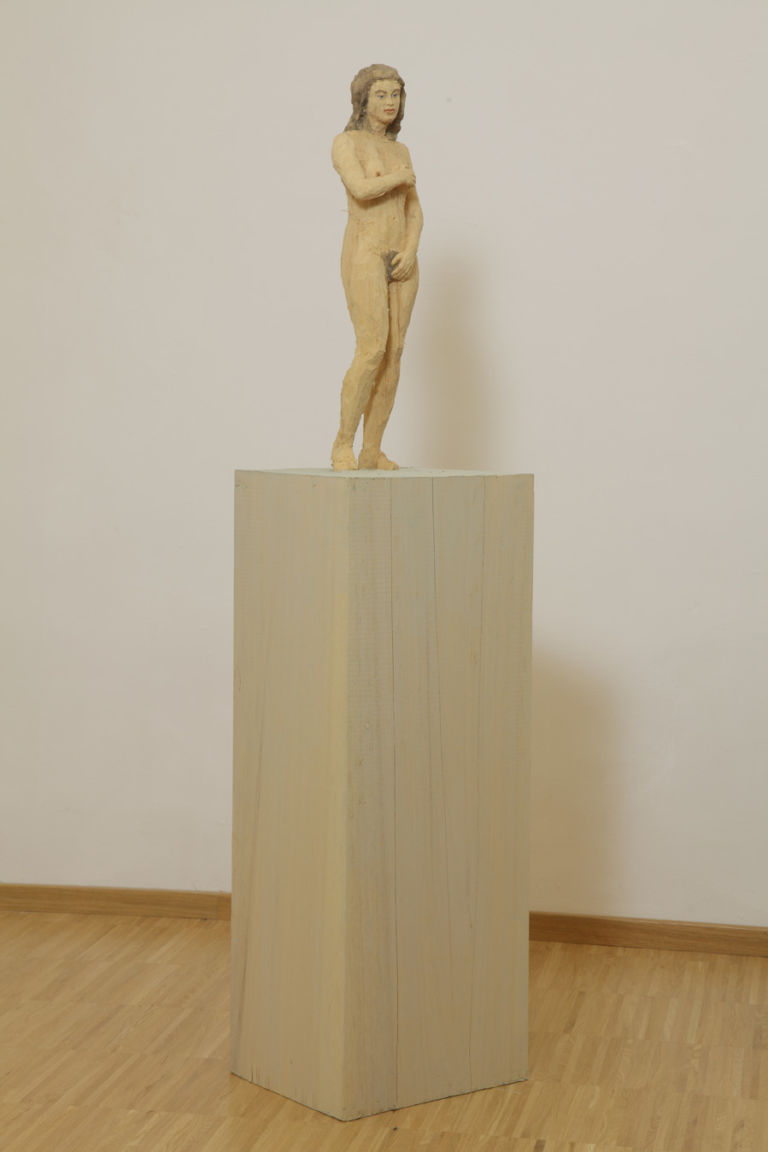 Priva di orpelli e dettagli, impassibile come la calma maestosità neoclassica è tutta la scultura di Stephan Balkenhol (Fritzlar, 1957; vive a Meisenthal e Karlsruhe). Che siano figure intere o bassorilievi, le sue opere sono la sintesi formale e l’essenza dei sentimenti umani. Apparentemente rassegnati, i corpi scolpiti nel legno e dipinti con leggere velature monocrome restituiscono tutta la dignità e la sopportazione di ogni individuo, in una contenutezza emotiva tale da non distinguere la semplicità materica dalla raffinatezza con cui le figure s’impongono. E l’autore svela per l’occasione una sua passione: le runaway di decollo e atterraggio. In mostra, un paravento in cui sono riprodotte, da ambo i lati, le assonometrie della pista del Lingotto. Forgiate da unici blocchi e contemplate dal loro Pigmalione, i corpi appaiono ieratici. In attesa del martirio o del soffio vitale.