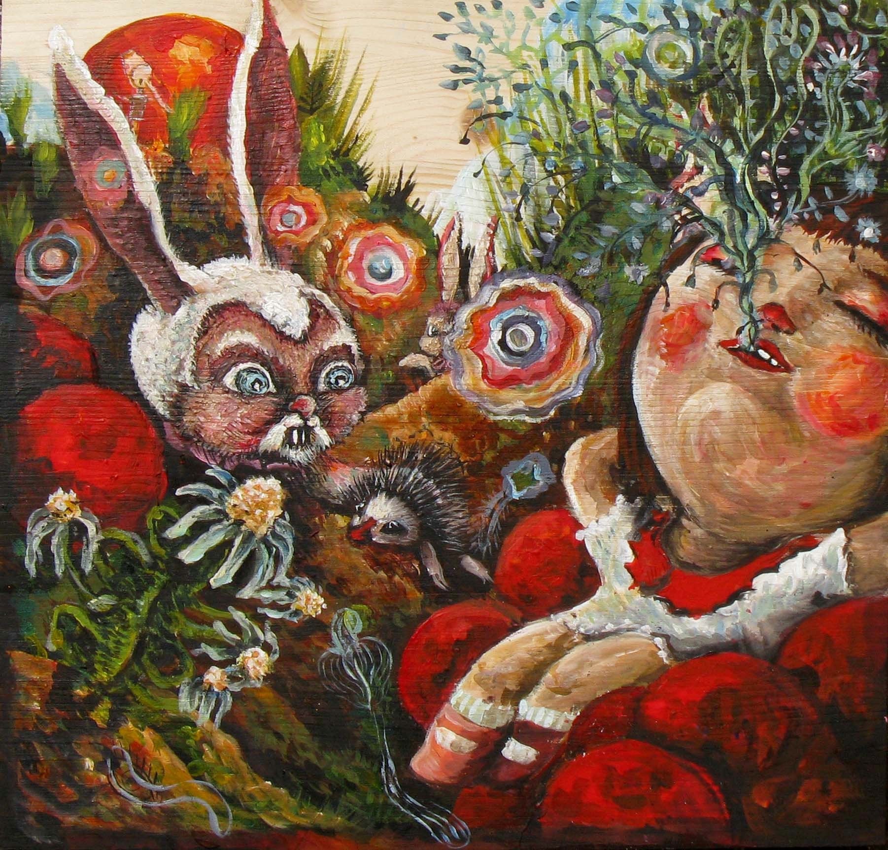 Partorisce deformità e inquietudini dell’anima, instilla dubbi, rivela segreti. In un percorso introspettivo che si perde nei meandri più oscuri dell’inconscio, Silvia Argiolas (Cagliari, 1977; vive a Milano) dà vita a esseri antropomorfi e paesaggi trasfigurati al limite della dissolvenza, che si avvicendano in un ciclo perpetuo di vita/morte e rigenerazione, per uno spaccato autobiografico che la vede drammaticamente protagonista. Al contrario, l’universo visionario e ipertrofico di Elena Rapa (Fano, Pesaro-Urbino, 1978; vive a Milano), apparentemente ludico, sembra provenire da fantasticherie circensi. Estetizzante e strutturato in maniera narrativa, è abitato da freak malinconici e allucinati, costretti da tenebre appena squarciate da spirali luminose. Un accostamento azzardato ma riuscito nonostante diversità stilistiche e concettuali. Ad accorciare le distanze, la concezione comune di ibridazione e mutazione di una natura tutt’altro che benigna.