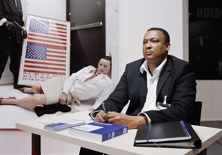 I lavori di Crispin Gurholt (Oslo, 1965) sono immagini fotografiche costruite finemente nei più piccoli dettagli, con rimandi al mondo del teatro e del cinema. Qui la fotografia non si propone di cogliere il reale com’è, ma è apertamente finzione, o meglio fiction. Il riferimento alla nozione di simulacro di Baudrillard nel titolo della mostra, Il Vernissage dei Simulacri, è utile a intendere il rapporto teorico fra arte e verità che sottende i lavori. L’artista predilige temi di carattere sociale e compone scene con una forte valenza narrativa, dove i ruoli consueti risultano invertiti e i personaggi sembrano scambiarsi le parti. Tutto, anche la violenza, pare essere colto in un momento cruciale, freddo e immobile. Dove il confine tra finzione, realtà e ironia si fa sottilissimo.