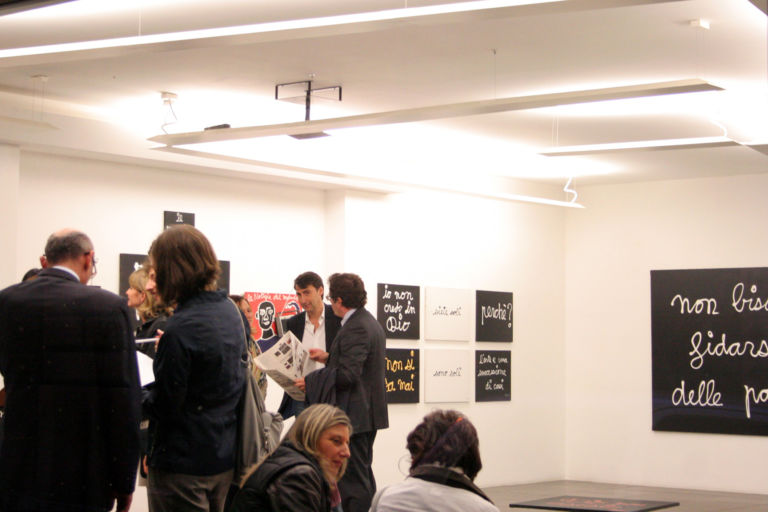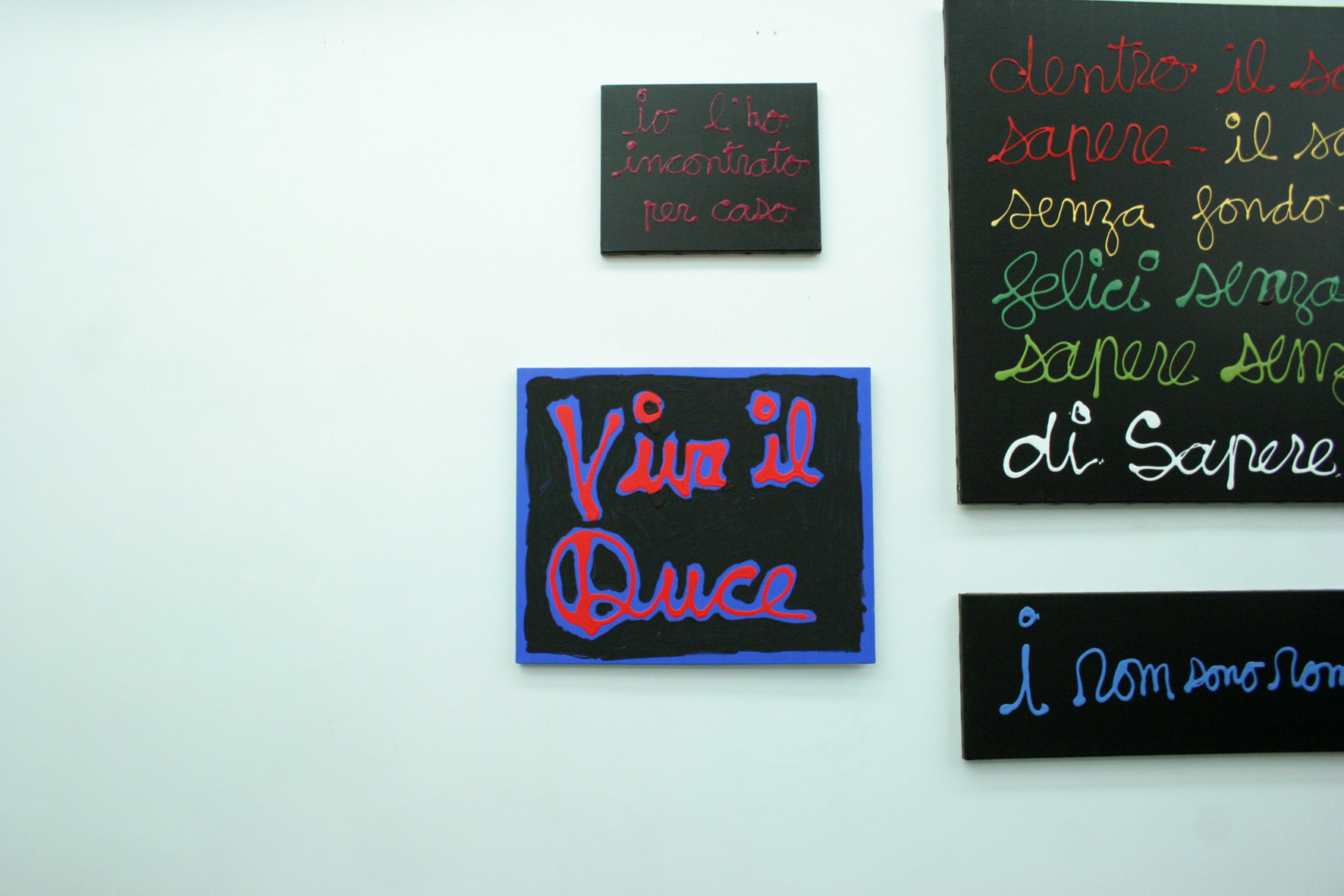 Consumato lo shock duchampiano, l’artista dell’Ecole de Nice torna a comunicare l’incomunicabile. La parola, affidata a testamento acrilico sulla tela, è pensiero rettilineo, lapidario; oltre il valore sfiancato dei simboli è il segno di un ego ridondante, fallico, smisurato e universale, è proiezione culturale – ovvero coloniale – allo stato puro. È l’incomprensibile e costante contraddizione della vita.