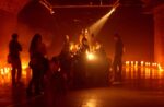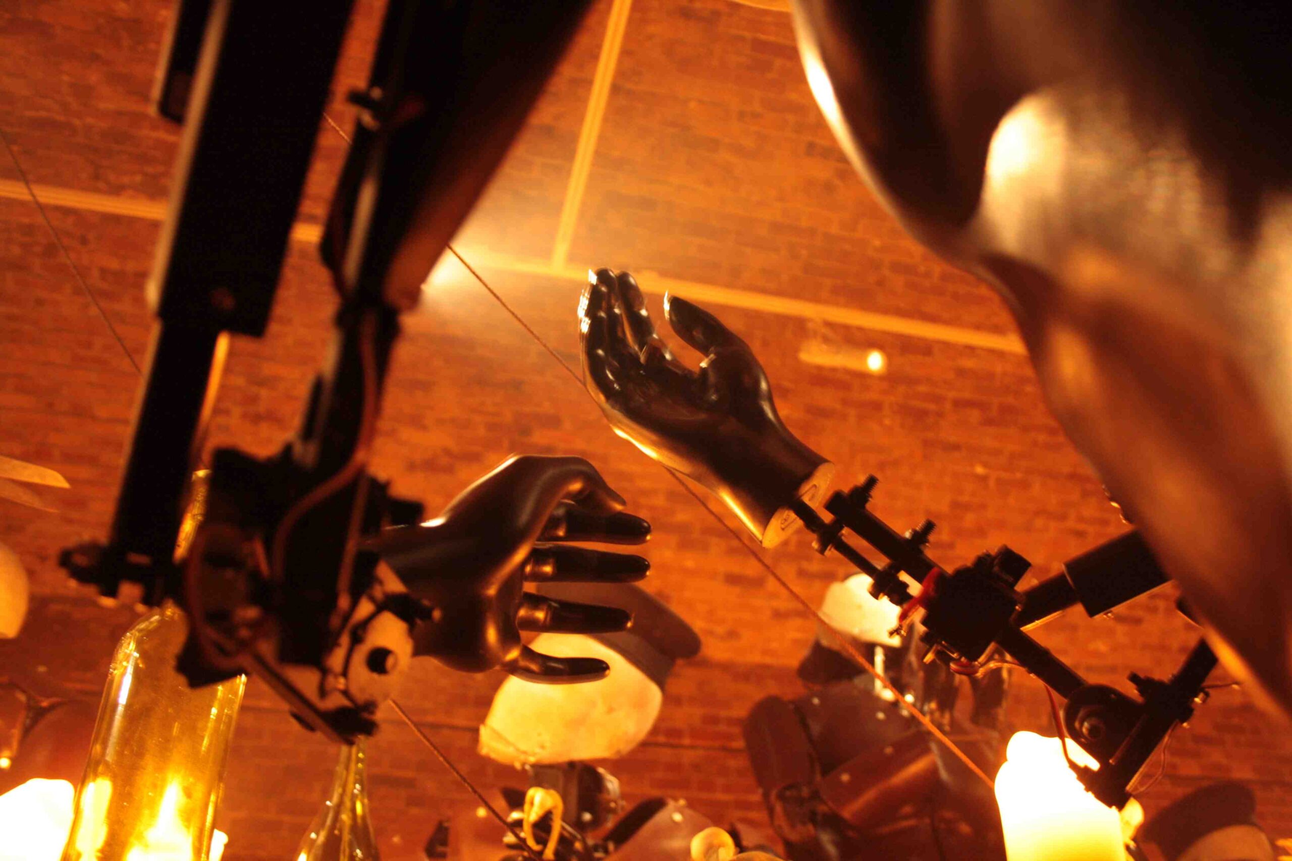 La sala di Black Rat Press, voltata in mattoni grezzi, è buia e fumosa, come l’imbocco di una galleria, illuminata da una schiera di candele disposte a terra lungo il perimetro. Nel cortile del Cargo, da attraversare per raggiungere BRP, c’è gente seduta in giro a bere birra, sole caldo e aria di relax del sabato mattina. Dietro la tenda di velluto le cose cambiano. Nel silenzio, le note di un piano e la voce dei personaggi meccanici riuniti intorno al tavolo, quello dell’Ultima Cena.