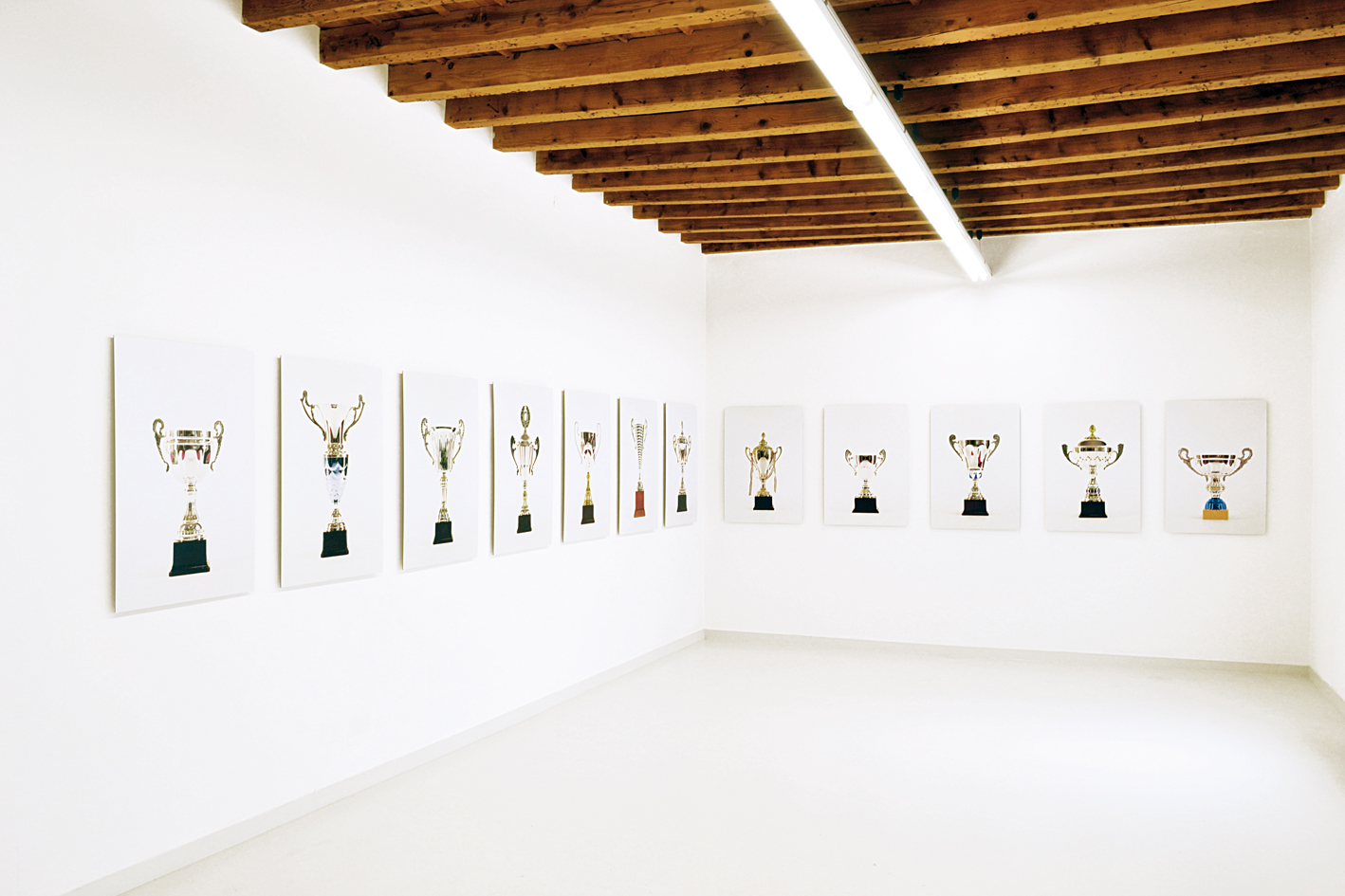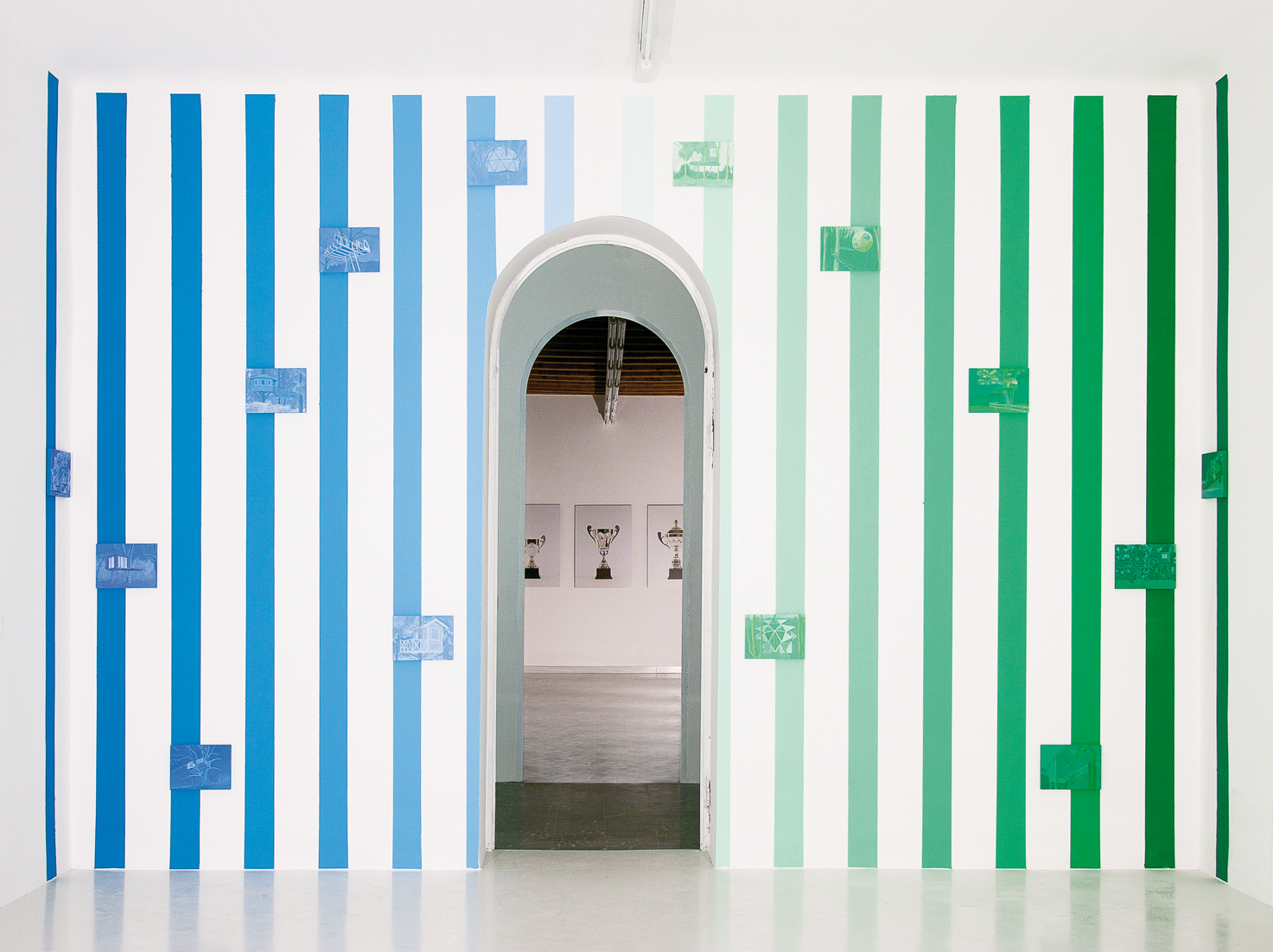Una parete occupata, a intervalli regolari, da strisce pantone: il ventaglio copre la scala di rifrazione della luce, interrotta in un apparente disordine da monocromi di piccolo formato. Lavoro ricco quello che Francesco Fossati (Carate Brianza, 1985; vive a Milano e Macherio) porta alla Cart di Monza. Lavoro modulare, che può essere riprodotto limitando o ampliando il range cromatico: dalla singola striscia fino all’intero arcobaleno le variabili sono molte, per un progetto che dribbla il concetto di site specific e – perché non guardare in alto – non avrebbe fatto brutta figura, per tema e maturità di visione, alla Biennale di Chipperfield. Ad accompagnare Hippy Architecture la serie recente delle terrecotte esplose, indagine sulla potenza pittorica della scultura; ma soprattutto Late Again: trofei presi alle spalle, colti di sorpresa. Espulsi da un contesto che tace il nome dei vincitori e persino il tema della competizione.
