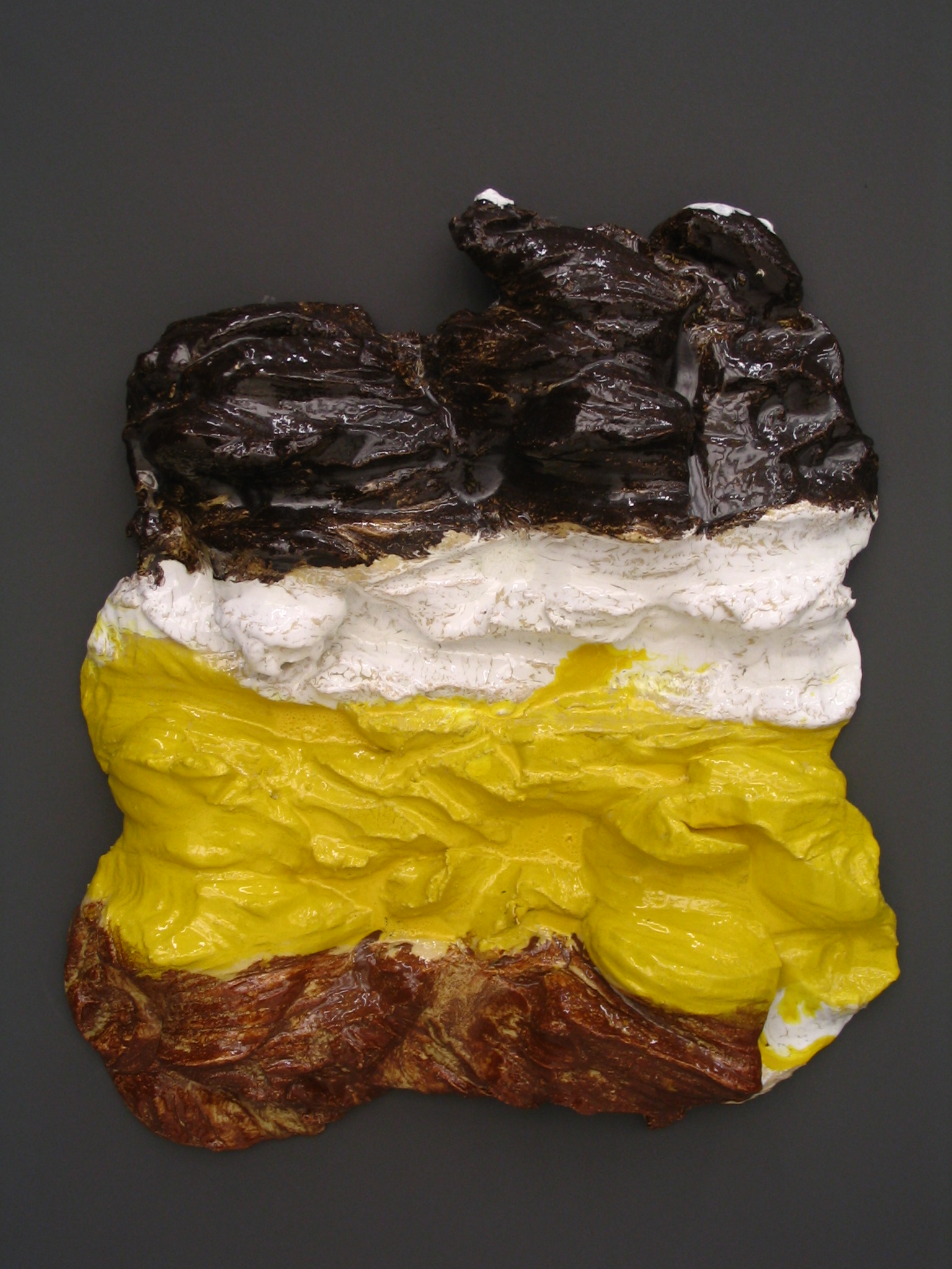 Al centro della grande sala, poi, un’altra detonazione. Una lunga serie di tecniche miste, collage metaforici ottenuti con una mescolanza felicissima di mezzi come il ready made fotografico, l’assemblaggio e la pittura. Tra astrazione e figura non c’è più confine, ogni tratto è assieme testimonianza delle nefandezze comminate all’uomo e strumento della sua ribellione. E poi, le sculture di gommapiuma, i quadri fatti con le piastre da cucina (accese), la versione femminista della Spiral Jetty di Robert Smithson.