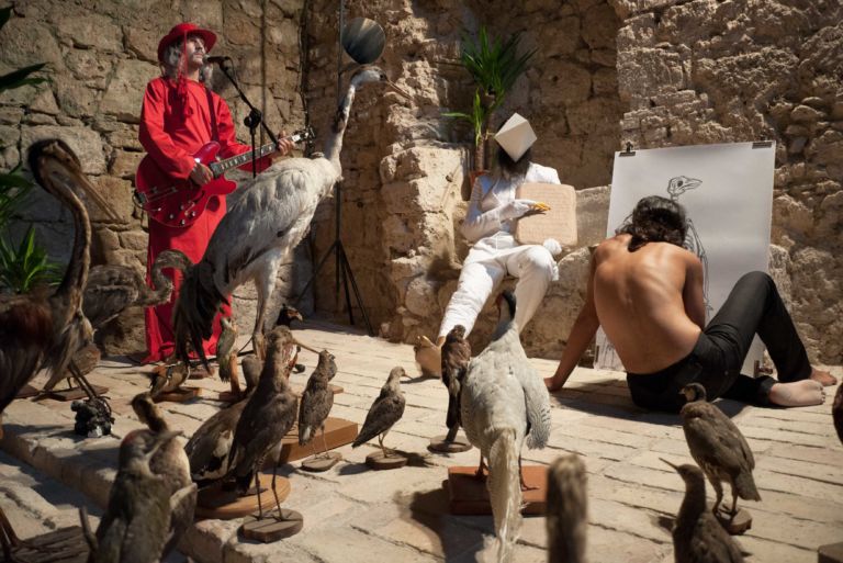 Sette foto di grande formato ripercorrono la produzione artistica di Luigi Presicce (Porto Cesareo, 1976): ognuna di esse testimonia l’intensa progettazione di performance e la straordinaria abilità di mettere in equilibrio il dato performativo, rituale e simbolico con il ponderoso carico figurativo e visuale. In questo sconfinato atlante di riferimenti riecheggiano qua e là i cascami visivi di grandi autori del cinema sperimentale come Anger, Jodorowsky oppure l’armeno Paradžanov, accanto a figure più direttamente inscritte nella storia dell’arte che spaziano da Byars, lo sciamanesimo di Beuys, il mistero di De Dominics e, forse ancor più fondamentale: l’intimo legame con modelli puri quali Giotto, che qui traspare nello splendido Atto unico sulla morte in cinque compianti (2012).