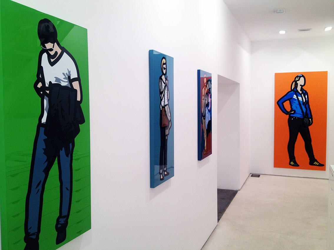 La rappresentazione e la percezione delle immagini sono da anni al centro dell’indagine di Julian Opie (Londra, 1958), così come l’interesse nella ritrattistica tradizionale e l’accostamento di fonti classiche e moderne. E così i Wallking studios, esposti per la prima volta, colgono atteggiamenti e azioni quotidiane di passanti e turisti, cristallizzandoli in lucide stilizzazioni pop, quasi statue greche del terzo millennio. C’è l’uomo contemporaneo, ridotto a icona, avvolto dalle marcate linee nere e dai colori brillanti, risultato della progressiva minimalizzazione del segno. I consueti giochi di linee e punti lasciano poi il posto allo studio del rapporto tra scultura e pittura e della matericità del linguaggio figurato, nei ritratti a mosaico realizzati insieme a Costantino Buccolieri (collaboratore di Enzo Cucchi, Mimmo Palladino, Mario Sironi), nei quali i pixel elaborati al computer sono tradotti in tessere musive, e nei busti in resina dipinti a mano, ulteriore indagine plastica sulla percezione delle ombre.