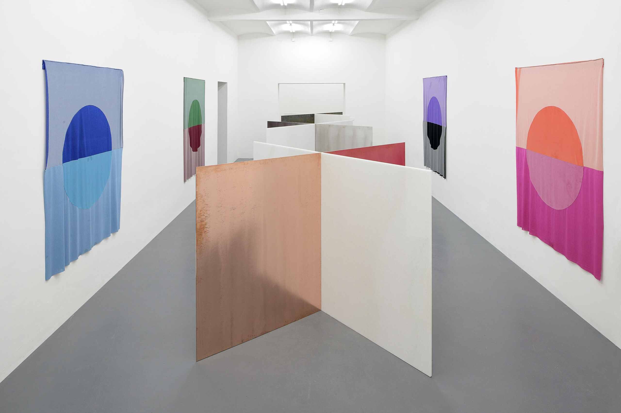 Sono tre le serie di lavori dell’americano Sam Falls (San Diego, 1984; vive a New York) esposte nello spazio longitudinale della sede romana di T293. Al centro, il monumentale trittico scultoreo in marmo e metallo a forma di X: un lavoro che nasce dall’osservazione della lenta erosione del tempo sulle lapidi marmoree di un cimitero parigino. Le sculture, destinate a essere esposte all’esterno, subiranno alterazioni dovute all’ossidazione per via dell’aria e del clima, mostrando visivamente l’ineluttabile passaggio del tempo. Sulle pareti sono collocati lavori in tessuto, sia in tela che in jersey. In entrambi i casi, i manufatti, parzialmente esposti all’aria, hanno subito alterazioni dovute all’intervento degli agenti atmosferici e della luce solare, che ne ha sbiadito il colore. I lavori di Falls – ultimamente di grandissimo successo anche commerciale – sono, in sintesi, dispositivi che intendono far riflettere sul silenzioso e imprescindibile operare del tempo.