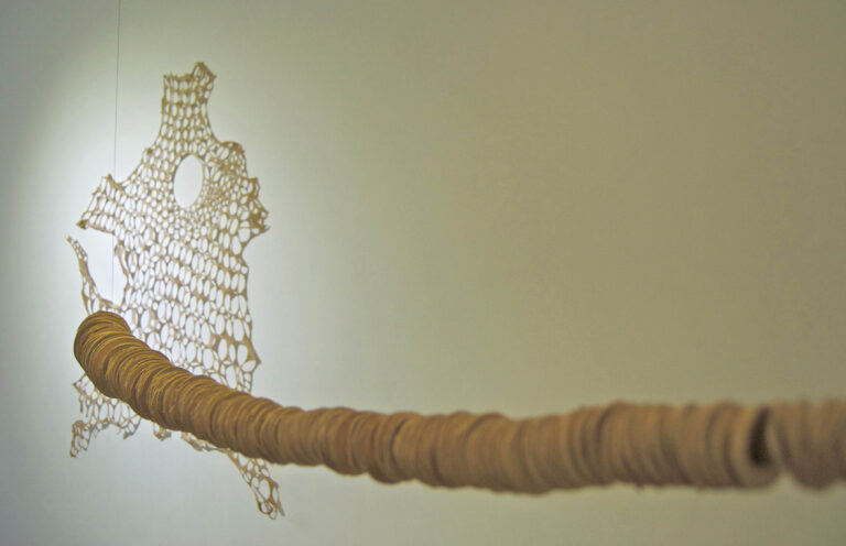 Le artiste coinvolte nella seconda tappa di Entre Nous inscenano un dialogo sul tema degli opposti delle forme. Il risultato è l’installazione Astral, da considerare un’unica opera. Un progetto aggraziato e bilanciato nei colori e nei profili, nonostante il lavoro delle due artiste sia molto differente. Se Delphine Valli (Roma, 1972) propone la lastra di ferro Disambigua, Claudia Zicari (Bergamo, 1975) “risponde” con il lavoro Piccolo gregge siriano, dove tanti anellini di pellame di pecora (alla prima concia) sono infilati in un lungo e sinuoso ramo di gelso che attraversa trasversalmente l’ambiente. Il lavoro prosegue con una curiosa “esaltazione” della materia, quando un brandello di pellame traforato, scarto del lavoro precedente, è eletto a opera e attaccato alla parete. Il gioco sul pieno e sul vuoto si conclude nella parte opposta della sala, dove Valli appoggia il perimetro di una forma su una campitura di colore rosa pelle, innescando una continuità a livello visivo.