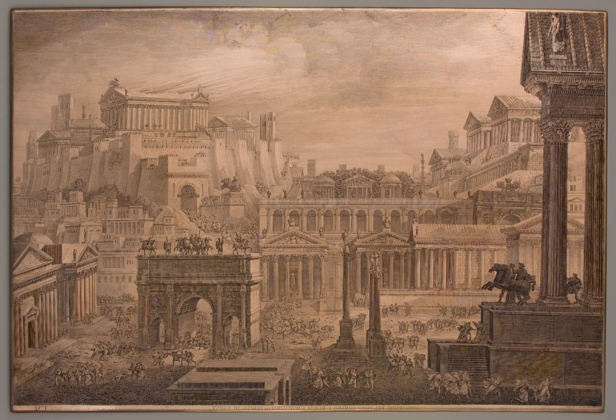 Le incisioni di Luigi Rossini (Ravenna, 1790 – Roma, 1857) stupiscono per la qualità altissima, la ricchezza di particolari, la maestosità. Ma anche per la modernità e per l’autonomia dello stile. Fatto sorprendente anche considerando il contesto: le sue stampe erano concepite come souvenir di lusso per la piccola massa privilegiata che si concedeva il Grand Tour in Italia (alla partenza di Piranesi da Roma, il ravennate prese il suo posto come “illustratore” della Roma dell’epoca).