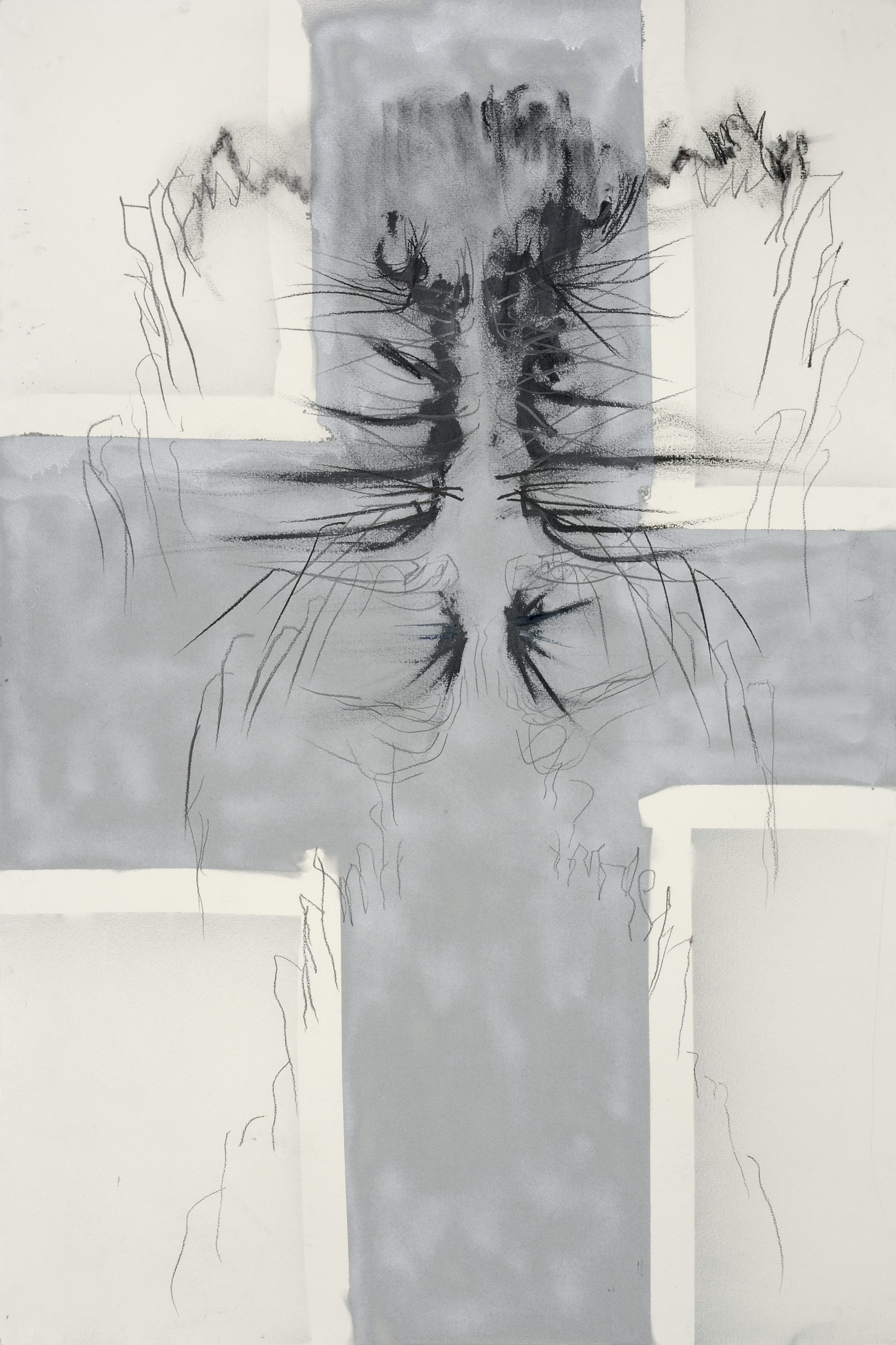 Segno che comunica, in maniera forse meno convincente di quanto lo faccia nella scultura, la sua dirompente voglia di immergere totalmente il proprio corpo, steso a terra, nell’opera. Le stesse intenzioni di orizzontalità che nelle tre dimensioni si rivelavano in una fisicità inquieta e dirompente, nelle opere grafiche conducono spesso a un risultato decorativo, lontano dal plasticismo che caratterizzava le sculture, ma in grado allo stesso modo di esprimere la vibrante inquietudine che muove la mano di Cerone.