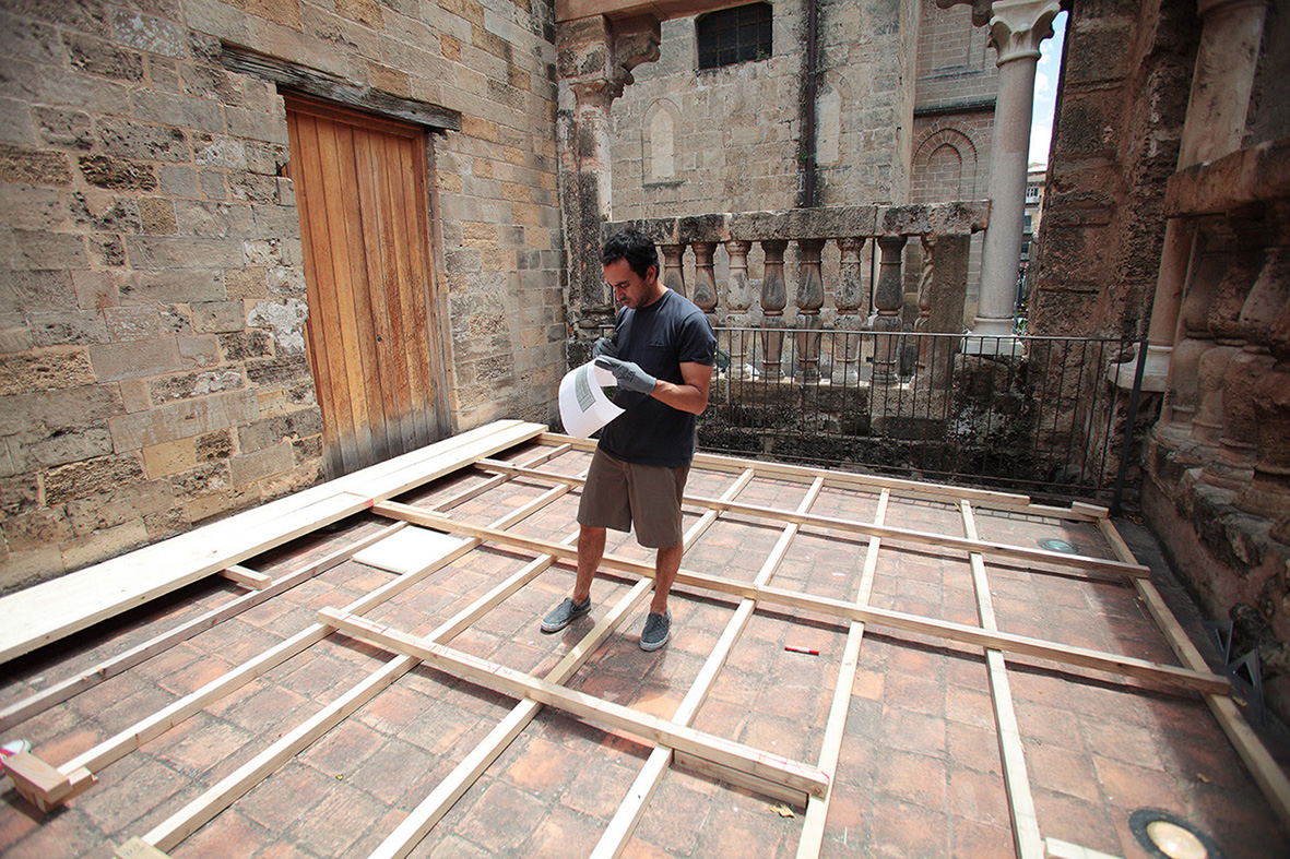 Così è il linguaggio: un inciampo, un fraintendimento, un accidente, un livido, un handicap; così è la vita: se non dimentichi l’inconveniente, impossibile è proseguire. Che tanto non si cade, se si aleggia. All that fall di Stefano Canto (Roma, 1974) è un lavoro su Palermo e oltre Palermo, che è sì un percorso a ostacoli; storici, architettonici, morali, visivi, perfino olfattivi. Così è il loggiato della splendida Cappella dell’Incoronazione con le sue pareti spezzate, le colonne affogate, la storia sull’uscio. L’opera dell’artista romano – nata in triangolazione con N38E13 e Museo Riso – si legge nuovamente come dispositivo. Il pavimento di nude assi di legno lievemente sospeso dalla luce dei led si flette, s’anima e svirgola sotto i passi dell’avventore che lo attiva. S’ingegna nel trucco.