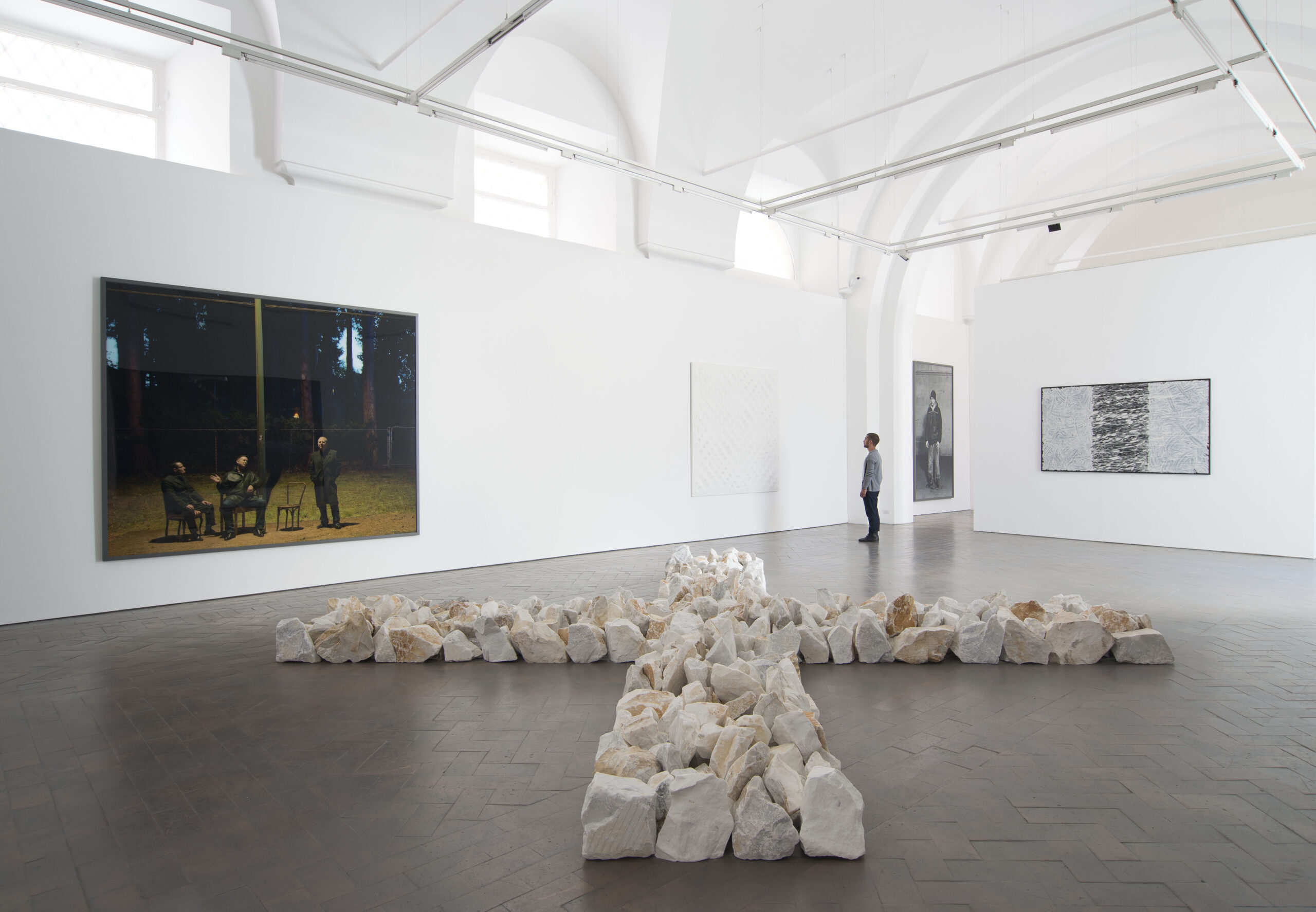 Enrico Castellani (Castelmassa, 1930) interviene sulla tela, deformandola in un ritmico gioco di protrusioni e rientranze, con attitudine metodica ascrivibile alla sua formazione di architetto, ma che guarda anche a Lucio Fontana e ai monocromi del Gruppo Zero. Nelle sue opere Richard Long (Bristol, 1945) traduce l’interesse per la qualità materica e imperfetta degli elementi naturali in una veste minimalista: Carrara cross, ampia installazione disposta a terra, si compone di numerose pietre di marmo di Carrara grezzo, riordinate in un insieme cruciforme di lineare pulizia grafica. Nelle tele gli sfondi si arricchiscono di un fitto reticolo di venature fluide e segni vorticosi. Stralci di guizzante irregolarità animano così un disciplinato sistema elementare. Le fotografie di Jeff Wall (Vancouver, 1946) catturano stralci della vita moderna. I colori sono carichi, l’elaborazione è lenta e si disvela progressivamente: gli individui che le abitano sembrano attori di un set cinematografico senza tempo, volutamente indistinto e costruito.