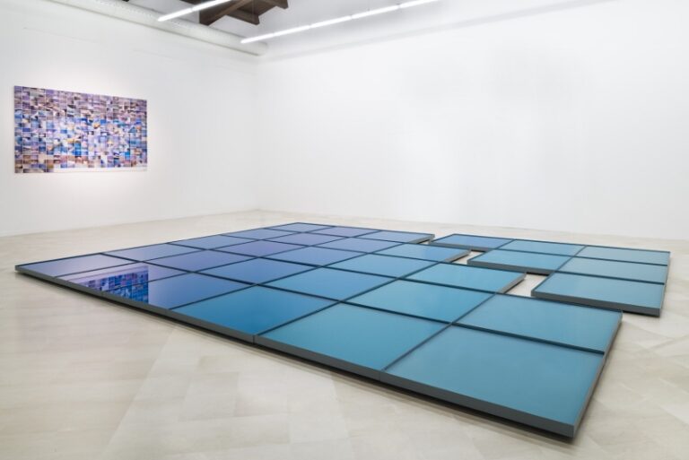 Da una parte 32 mq di mare circa, opera del 1967 proveniente dalla GNAM di Roma, costituita da una lamiera in ferro e acqua colorata all’anilina nelle declinazioni dell’azzurro più vivido.