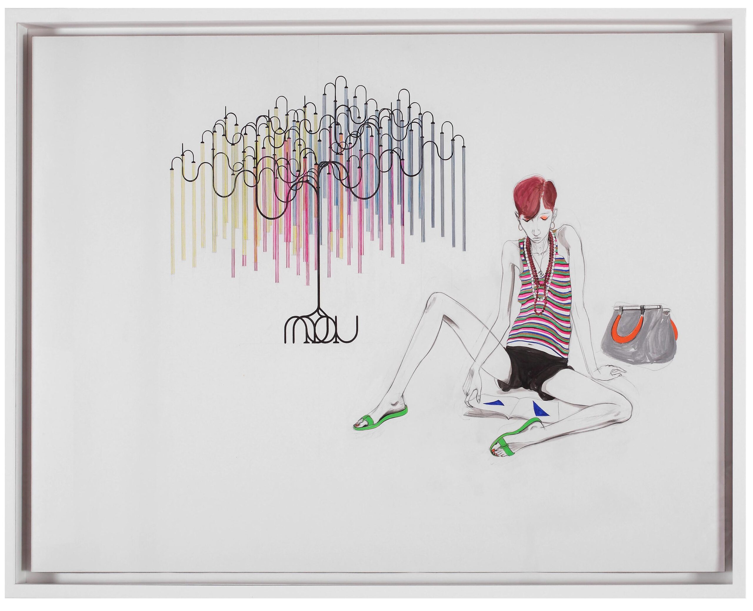 The Isladers è il progetto iniziato da Charles Avery (Oban, 1973; vive a Londra e Mull) nel 2004, nel quale racconta degli abitanti di un’isola immaginaria e delle loro vite. In quest’occasione, per lo Studio Sales l’artista scozzese ha prestato attenzione a tutto lo spazio espositivo, realizzando disegni, walldrawing e alcuni oggetti, presentando la scena giovanile della città portuale di Onomatopoeia. Lo spettatore è coinvolto come se divenisse turista/viaggiatore con la possibilità di “entrare” e curiosare nel mondo young degli Islanders, conoscerne le abitudini e gli stili di vita: da quelli che per racimolare qualche spicciolo raccolgono le alghe e le vendono a peso, come è illustrato in Untitled (Kelp weighing), a quelli che bighellonano fumando sui gradini (Untitled (Youths Smoking on Steps)), nuotatrici o giovani teenager nella loro stanza. Un giorno l’artista spera di raccogliere tutto il frutto della sua fantasiosa parallela dimensione in volumi enciclopedici, benché finora vi siano solo i due fermalibri che li conterranno.
