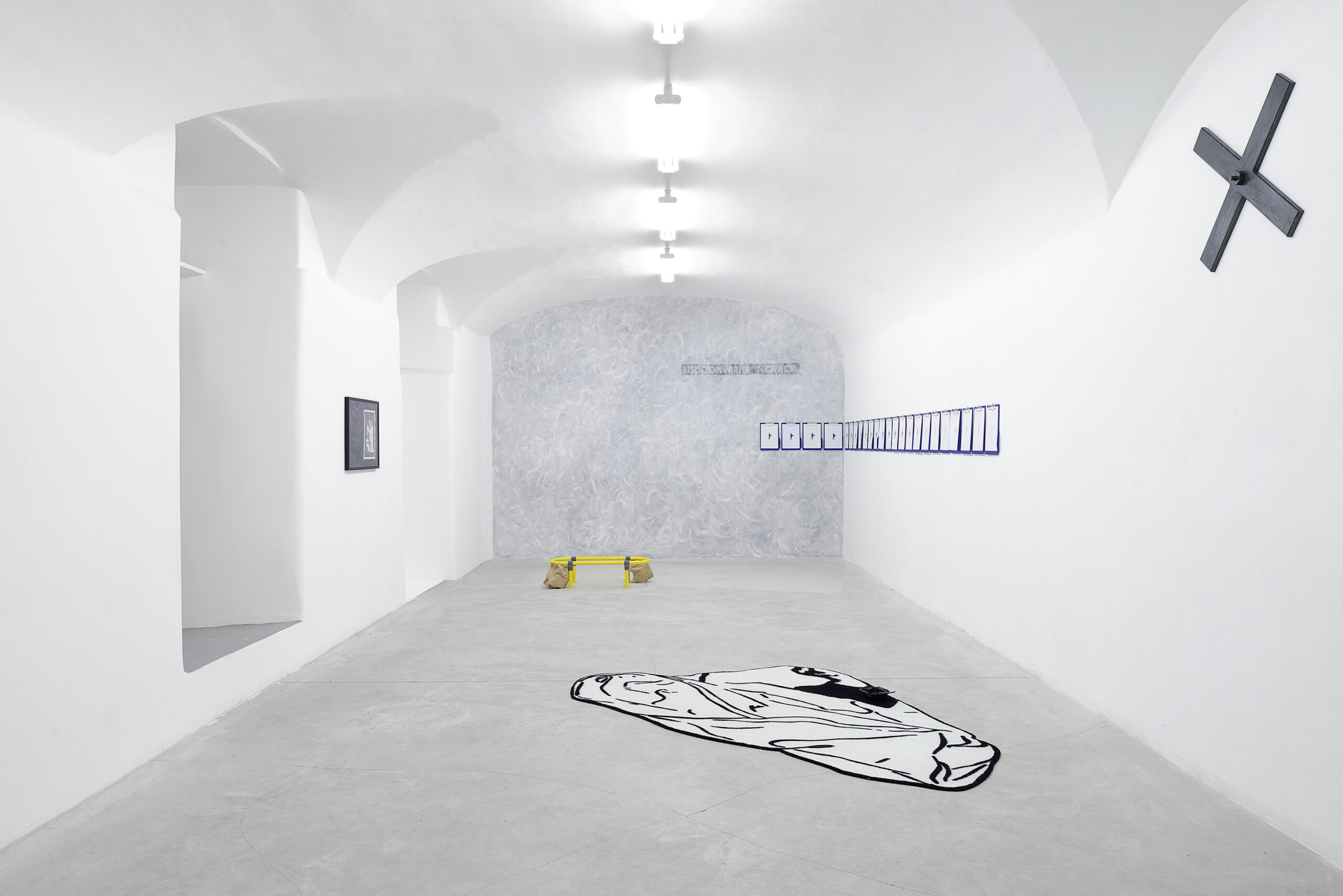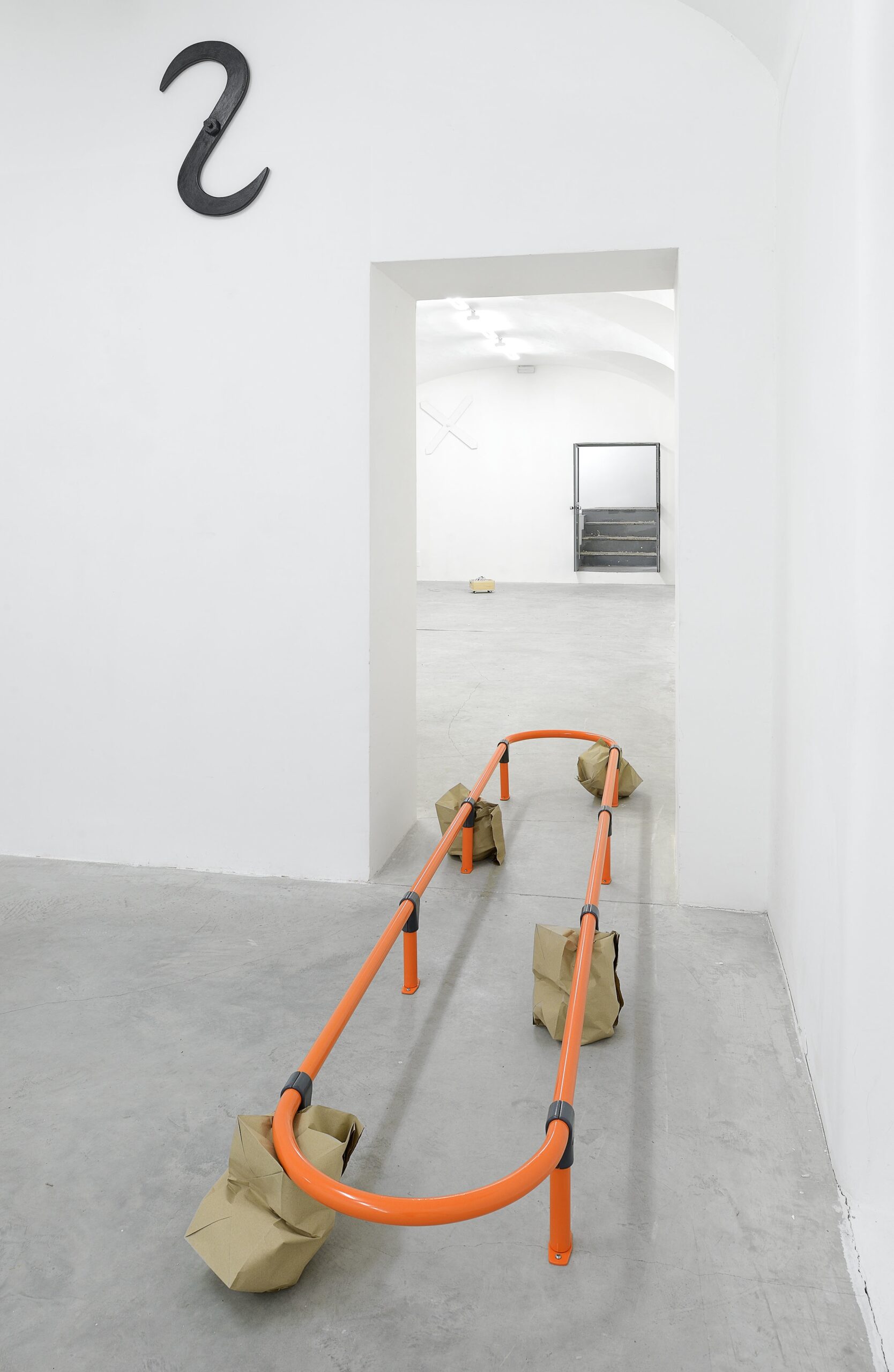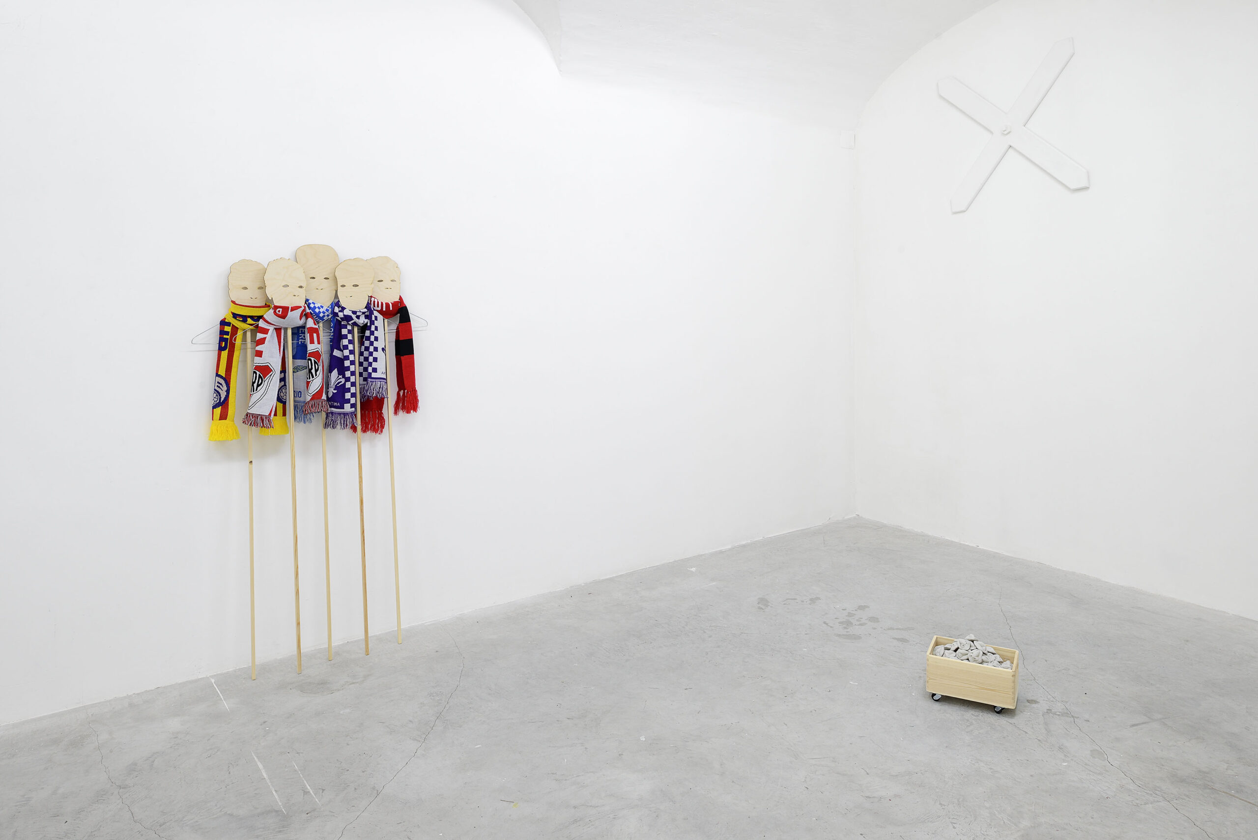 Tutta la mostra, allestita nella nuova sede della galleria in via Giovanni Pascoli 21 a Roma, è una mappa della vita che John Henry Newton (Swindon, 1988; vive a Londra) svolge ogni giorno. La ripetizione di azioni semplici scatena nell’artista un’osservazione della realtà da un diverso punto di vista: l’atto di camminare si può ritrovare in tutte le opere in mostra, dalla baguette nella borsa ai manichini con le sciarpe delle squadre di calcio, sono le tracce della vita che l’artista svolge ogni giorno dal momento in cui esce da casa. Elementi semplici, comuni, ordinari, ma tutti simboli di una memoria assai cara a Newton, che arriva a esaltarli e a mostrarli in tutta la loro straordinaria semplicità come se fossero pezzi da museo degni di una grande mostra.