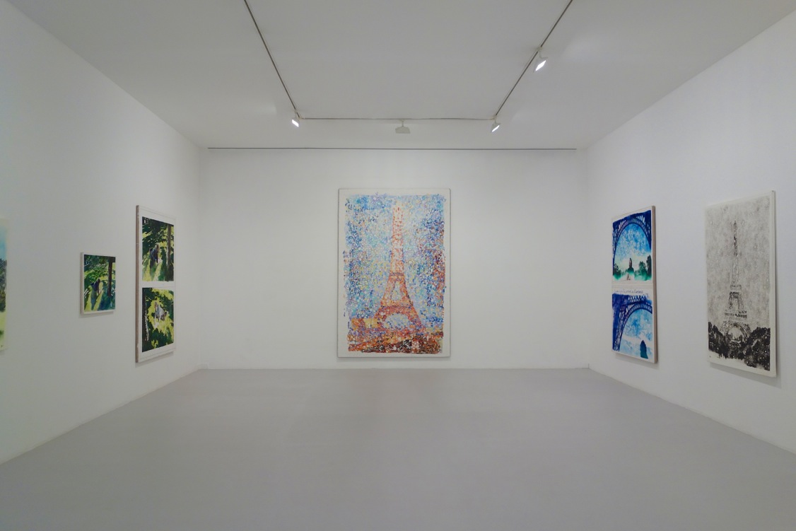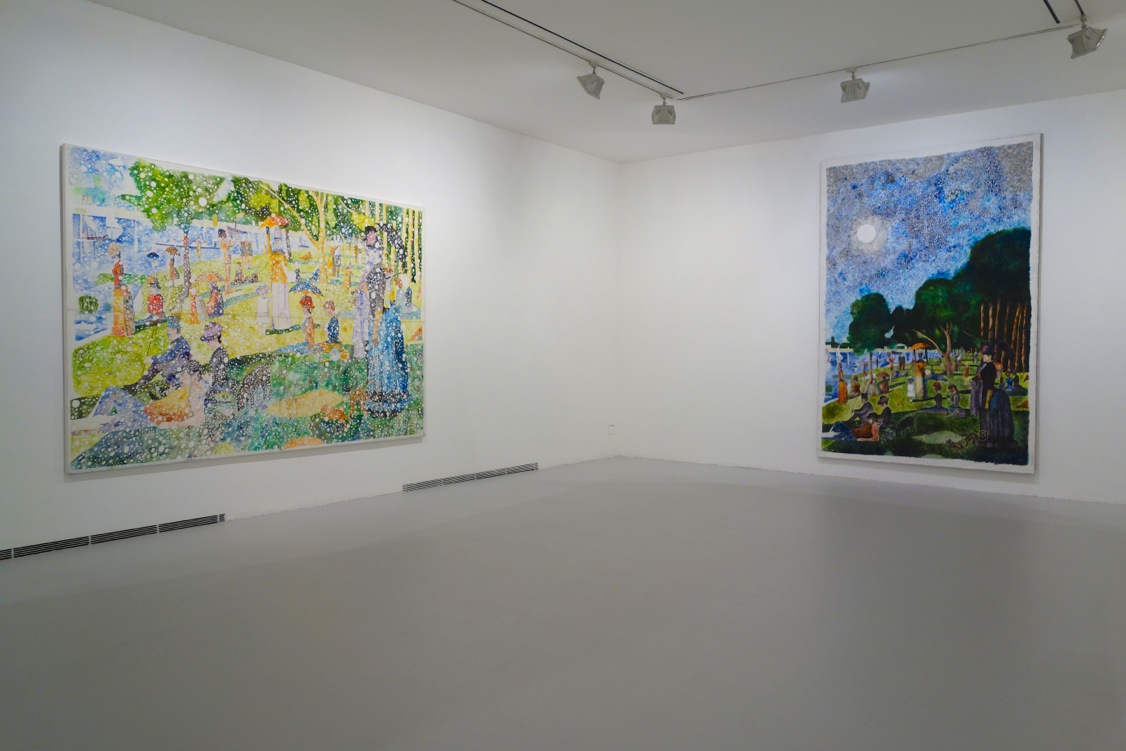 Uno studio che ha certo dell’ossessivo, ma anche tanta ironia perché, dove originariamente c’era puntinismo, qui si sostituisce una eterea nevicata, e anche del racconto autobiografico, dato che rivelano momenti vissuti direttamente durante un soggiorno a Parigi, ma anche, infine, del sottile onirismo che emerge nella deriva di questi vissuti in sogni ideali.