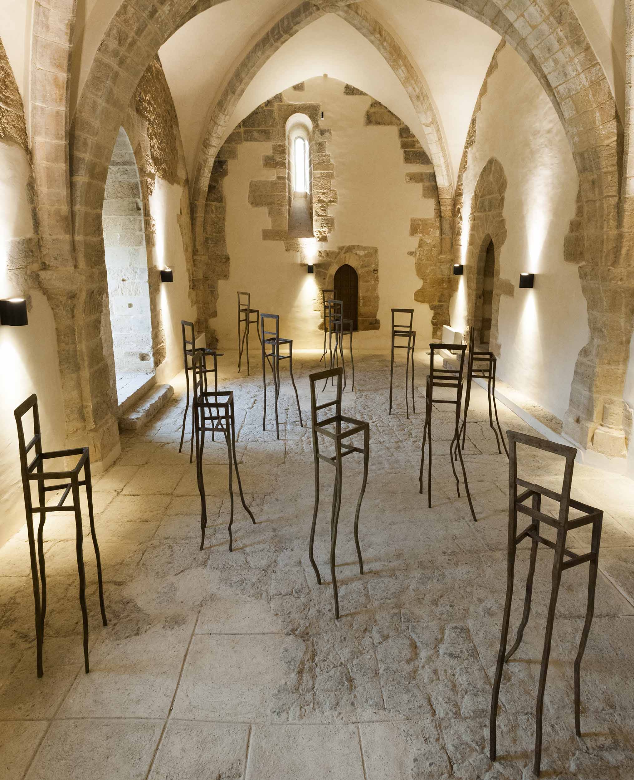 Le grandi installazioni sono invece allestite nelle sale più ampie del Castello e nel cortile. Nella Sala gotica del Ricevimento, svettano dialogando tra loro gli Eroi: dodici sedie con piedi altissimi, dall’impatto surrealista, evocano le radici o i rami degli alberi ondulati dal vento; mentre nella stanza attigua incontriamo Prismi, ventisei sculture in bronzo – maschere teatrali e simboli apotropaici – che insieme disegnano ancora le diagonali di un ottagono. Nel cortile interno sfilano dodici sagome in acciaio corten alte quattro metri, tutte nella medesima posa, metà uomini e metà animali, forse fauni nell’atto della concentrazione o della riflessione filosofica (riecheggia l’influsso che su Giuseppe Gallo ebbero i naturalisti meridionali: Campanella, Giordano Bruno e Telesio).