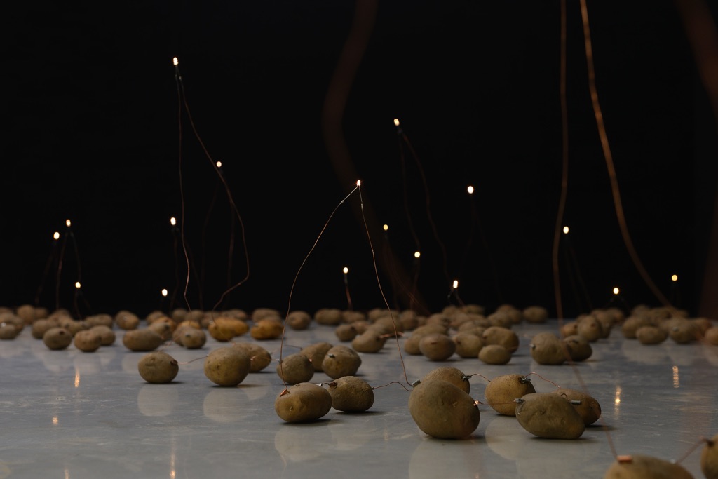 Nella drawing room, Isolated Systems Vol. 1, installazione costituita da centinaia di patate, suddivise in gruppi circolari di sette, connesse da circuiti elettrici che illuminano singole lampadine LED. Poetica, fragile comunità entropica, con la forza evocativa di un sito sepolcrale arcaico sotto un cielo stellato o di un monumento commemorativo, metafora della “nostra diminuzione mortale”.