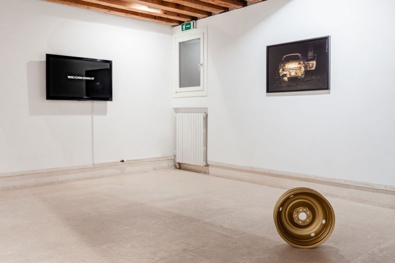Pochi elementi quanto le immagini possono influenzare l’esistenza delle persone attraverso la pubblicità, i mass media e i social network, sino a insinuarsi negli spazi più intimi in cui si forma la soggettività. Viviamo immersi in una molteplicità di narrazioni visive portatrici di “verità” rassicuranti che prefigurano un benessere fisico, sociale ed economico. Attorno a questi spunti si muove la mostra Good Night, and Good Luck, curata dagli studenti di The School for Curatorial Studies Venice, che in essa hanno compendiato gli stimoli del corso coordinato da The Cool Couple (fondato nel 2012 da Niccolò Benetton e Simone Santilli). Nell’installazione Karma Fails (2016) il collettivo utilizza la retorica del movimento New Age per smascherare con ironia le forme odierne di competitività, figlie di una cultura individualista che ha soppiantato le strutture sociali aggreganti. Marco Ceroni (Forlì, 1987) inserisce nel paesaggio un elemento estraneo – la carcassa di un’auto e un cerchione che, una volta dorati, perdono la loro funzione originaria –, sovvertendone così la normale percezione e idealmente proponendo nuovi scenari. Stefano Serretta (Genova, 1987) nella fotografia Landscape (2015) crea un chiaro rimando all’iconografia del gruppo terrorista Daesh, ma il suo intento non è narrare in senso cronachistico degli specifici accadimenti, quanto far riflettere sulle strategie di comunicazione a essi legate. Infine il collettivo Discipula (fondato nel 2013 da MFG Paltrinieri, Mirko Smerdel e Tommaso Tanini) con Efficacy Testing Stream (2015) si appropria di alcune immagini dell’industria alimentare che, sovrapposte e stratificate, generano un magma visivo inquietante, capace di ribaltare i meccanismi di creazione del bisogno normalmente utilizzati nelle strategie pubblicitarie.