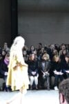 Alla faccia di chi storce il naso di fronte a un intervento così commerciale all’interno di un museo, l’allestimento del grande atrio si è rivelato efficace senza essere invasivo. Un’ampia parete di specchio isolava l’area dedicata alle sfilate, alla quale potevano accedere solo gli accreditati, ma di fatto dalla balconata della stessa Turbine Hall, così come dalle vetrate dei diversi piani del museo, anche i visitatori del museo potevano assistere alle sfilate. Un modo di rendere accessibile, seppur non proprio dalla prima fila,  il mondo sfavillante di modelle, passerelle, fotografi, e ospiti da front row.