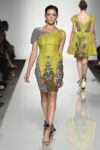 Anche Evans conferma il suo gusto per l’eleganza e una femminilità raffinata, ornata di venature etno, ma spingendo più sulla sperimentazione: abiti cortissimi o lunghissimi, pantaloni arricciati e top corti, vivono di asimmetrie radicali, linee sghembe, geometrie dinamiche, sovrapposizioni fra materiali lucidi, opachi, trasparenti, tinte accese a contrasto – dagli azzurri scintillanti a i rosa fragola – e spicchi di tessuti floreali.