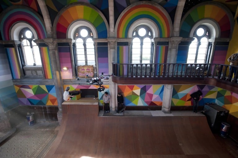 Il progetto di riqualificazione, finanziato in principio con Kickstarter, è risultato così allettante da essere interamente adottato dai Red Bull Studios. Ed è stato lo street artist madrileno Okuda San Miguel a occuparsi del restyling interno. Sui soffitti del Kaos Temple, come adesso viene chiamato, al posto dei Bambinelli e delle Madonnine ci sono teschi caleidoscopici, arcobaleni e murales coloratissimi; un gioco di luci si riflette sull’immensa pista centrale, come facevano i cristalli nella stanza di Pollyanna, ma in scala molto più grande. Sulle volte dove prima c’erano angeli e Santi ora campeggiano crani enormi e facce di scimmia in modelli variopinti, costellazioni formano sagome di colombe e la luce del sole che filtra dalle finestre riempie lo spazio di arcobaleni.