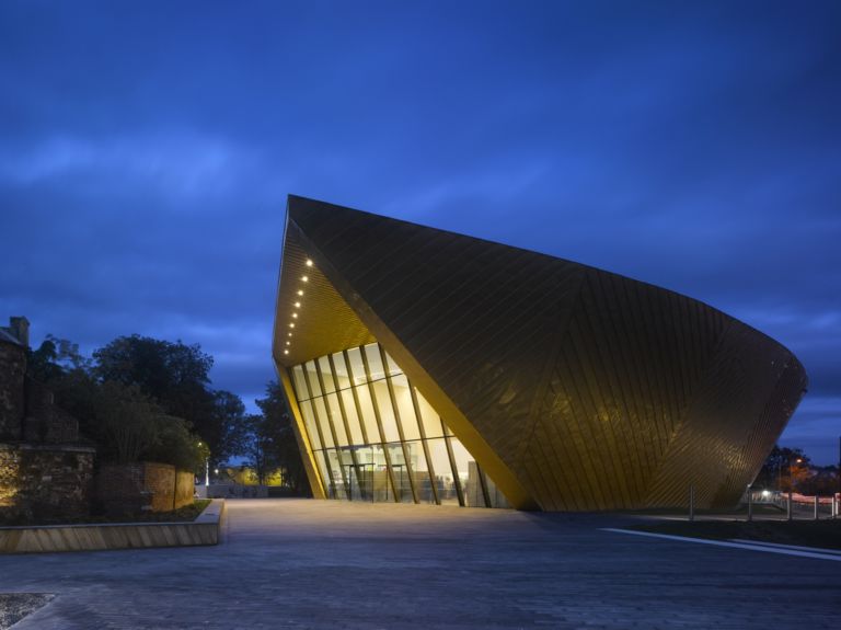 L’idea cardine del progetto vincitore sta nella morfologia del nuovo corpo di fabbrica, un semicerchio prezioso, ricoperto di pannelli in lega di rame e alluminio dorati. Raffinato dunque, perché – grazie al colore scelto per il rivestimento – ricorda a sua volta un ritrovamento archeologico (un monile spezzato),  rispettoso perché non troppo autoreferenziale come solo molti musei contemporanei sanno essere, ad un solo piano, e leggermente staccato dal suolo, per far si che le rovine interrate restino indisturbate.