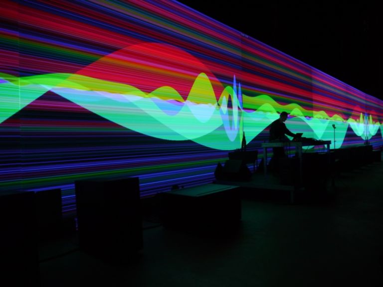 Cinquanta metri di videowall amplificati da ruffiane superfici specchianti, impulsi sonori tradotti in segni digitali: questa l’opera, installata – in proroga – fino al prossimo 6 gennaio. Un vero e proprio strumento, musicale e visuale: suonato live da Nicolai nel corso di un’oretta buona di set serrato. Algido e impassibile, asciutto come uno stilita – o come i Kraftwerk, se preferite – Nicolai scaglia su un pubblico accorso in massa un’onda sonora stile tsunami; spara input visuali come fosse un M16: disorienta, stordisce, affascina e conquista.