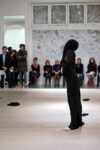 Pubblico stranito, così come doveva essere:la Arjona si presenta completamente bardata di nero e da vita ad un finto streeptease; le movenze sono placide e sinuose, quasi una danza sciamanica; ma sotto ogni strato di tessuto, calza o reggipetto che sia, si nasconde un altro capo di vestiario. Un gioco ininterrotto di scatole cinesi, che prolunga l’attesa all’infinito, nella tensione emotiva di un irrisolto circolo vizioso. Ti aspetti un nudo che non arriva mai: nella performance, curata da Julia Draganović e Claudia Löffelholz per LaRete Art Projects, la cinica e ironica critica all’immagine diffusa di un corpo femminile mercificato senza ritegno.