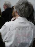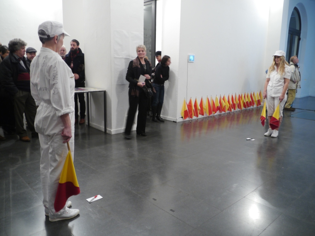 Introduce la serata Nanni Balestrini, tocca poi all’azione di Doris Jauk-Hinz ed Eva Ursprug: con la complicità del pubblico scrivono in aria, usando bandierine da segnalazione, parole che vanno da vista a colletivo. Il linguaggio è quello della nautica, ignoto ai più: sconosciuto, soprattutto, agli stessi improvvisati performer, che si trovano megafono passivo di una voce che non possono comprendere.